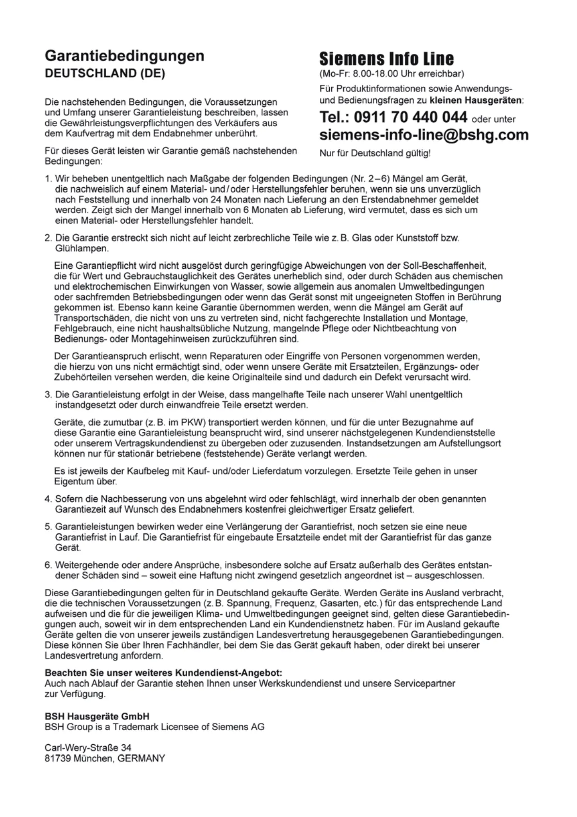 Siemens VS06A111 - Warranty and Service Information; Siemens Info Line