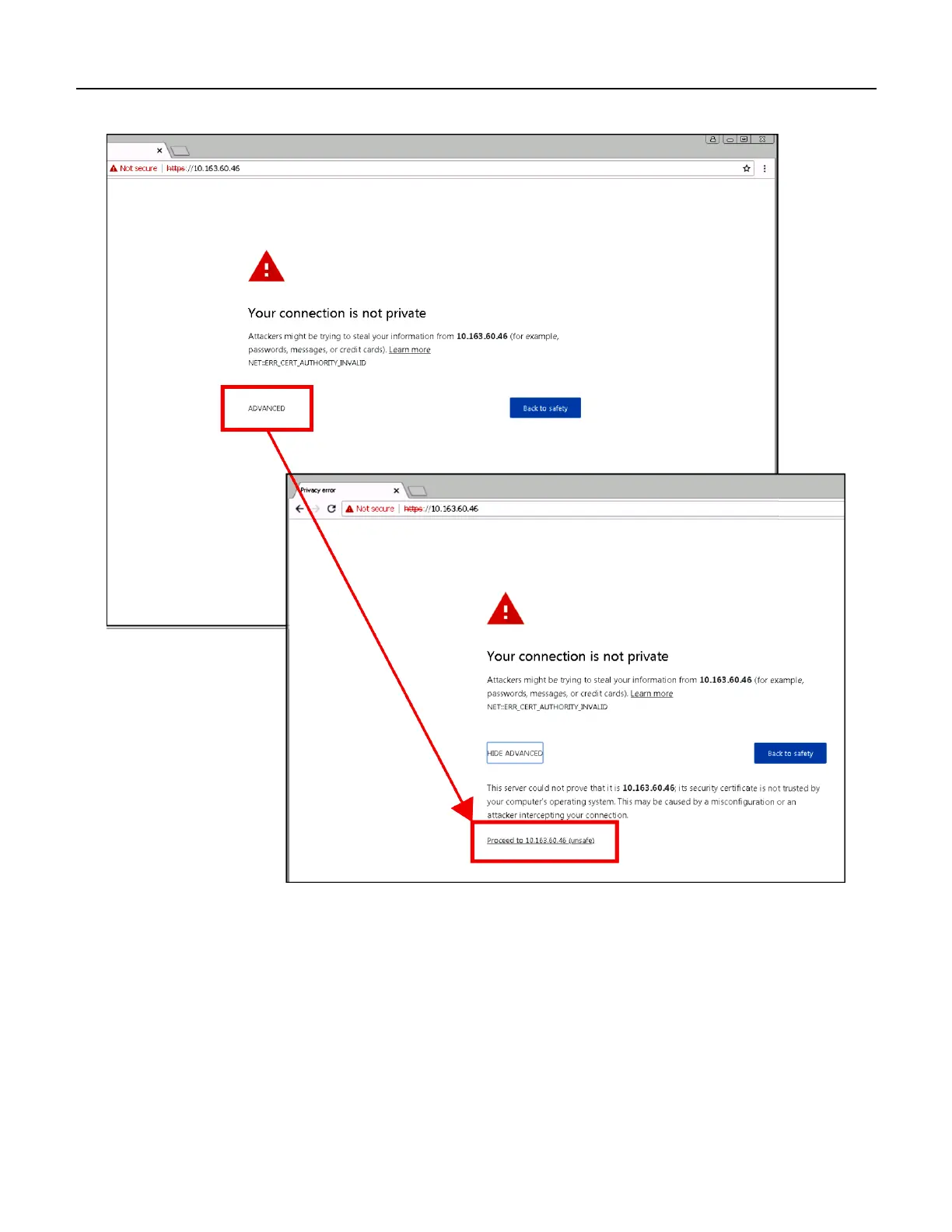 The web browser may display the screens shown below regarding the connection.