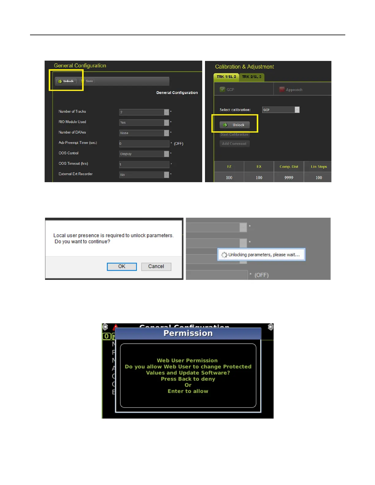 To enable the GCP programming or Calibration, first unlock the screen from the WebUI by pressing the