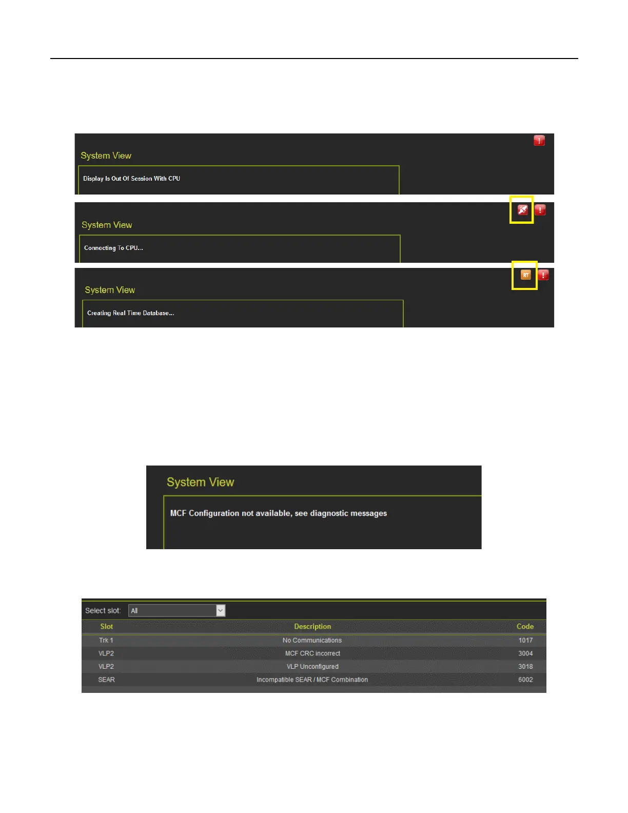 If the Display module is not in session with the CPU, it will be indicated with just a red exclamation point