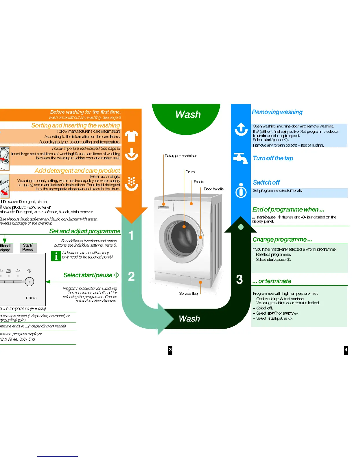 Siemens WM08E460BC - Washing Machine Operation Guide; Laundry Loading and Detergent Addition; Program Selection and Adjustment; Completing the Wash Cycle
