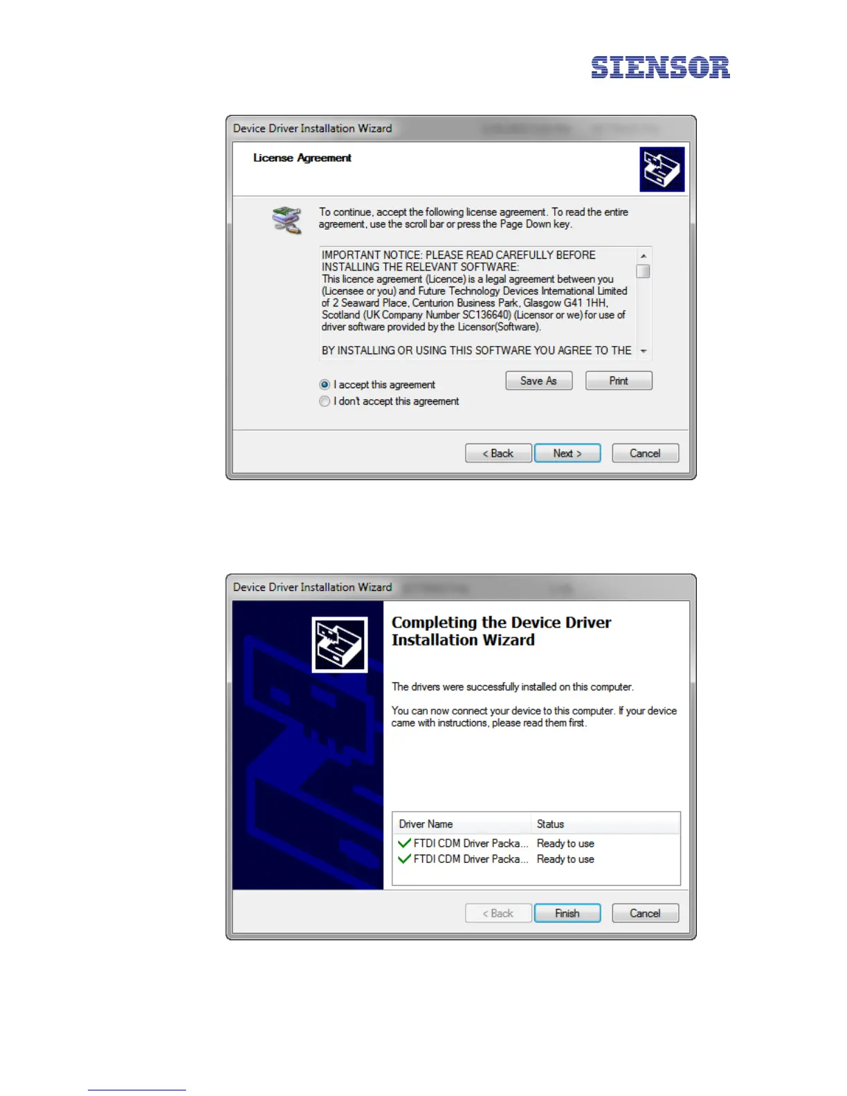 Siensor UNIC - Fig. 4.2 the Device Driver Installation Wizard Window - License Agreement; Fig. 4.3 the Device Driver Installation Wizard Window - Completing the Installation