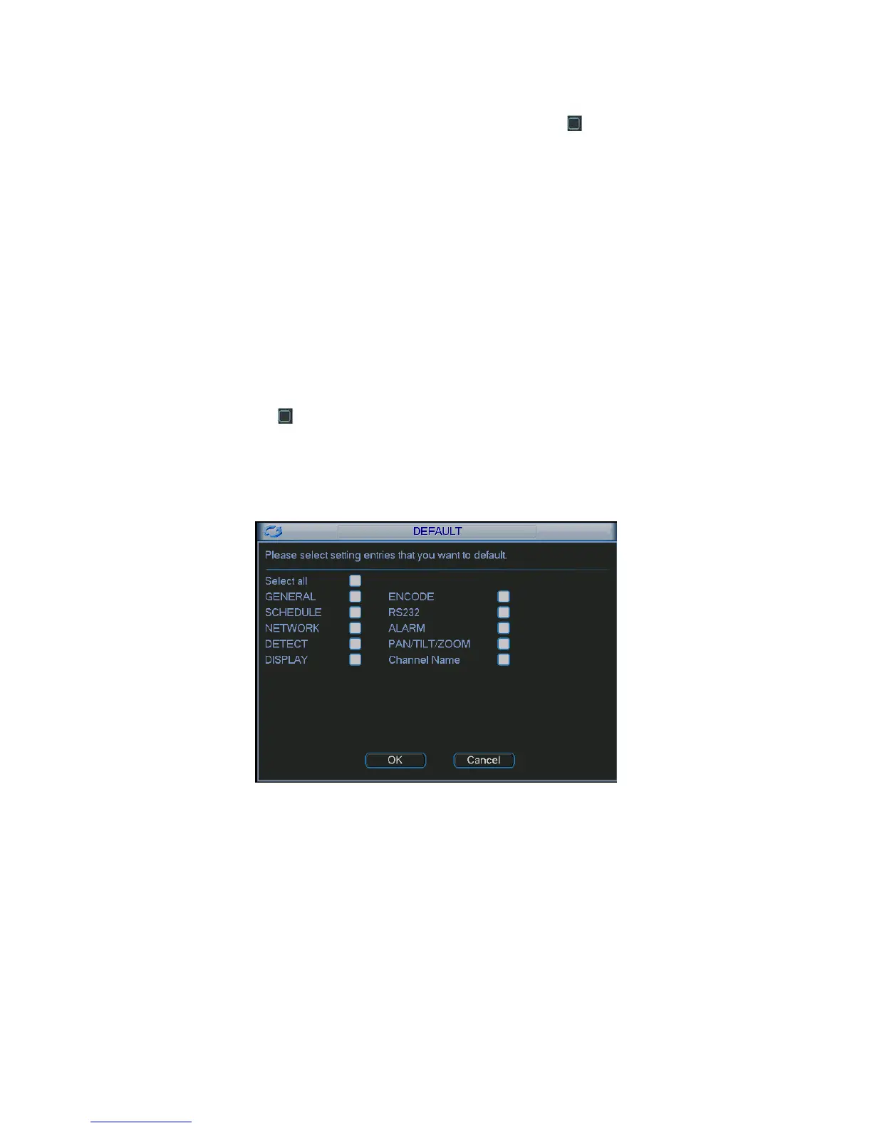 Click default icon, system pops up a dialogue box. You can highlight to restore default factory
