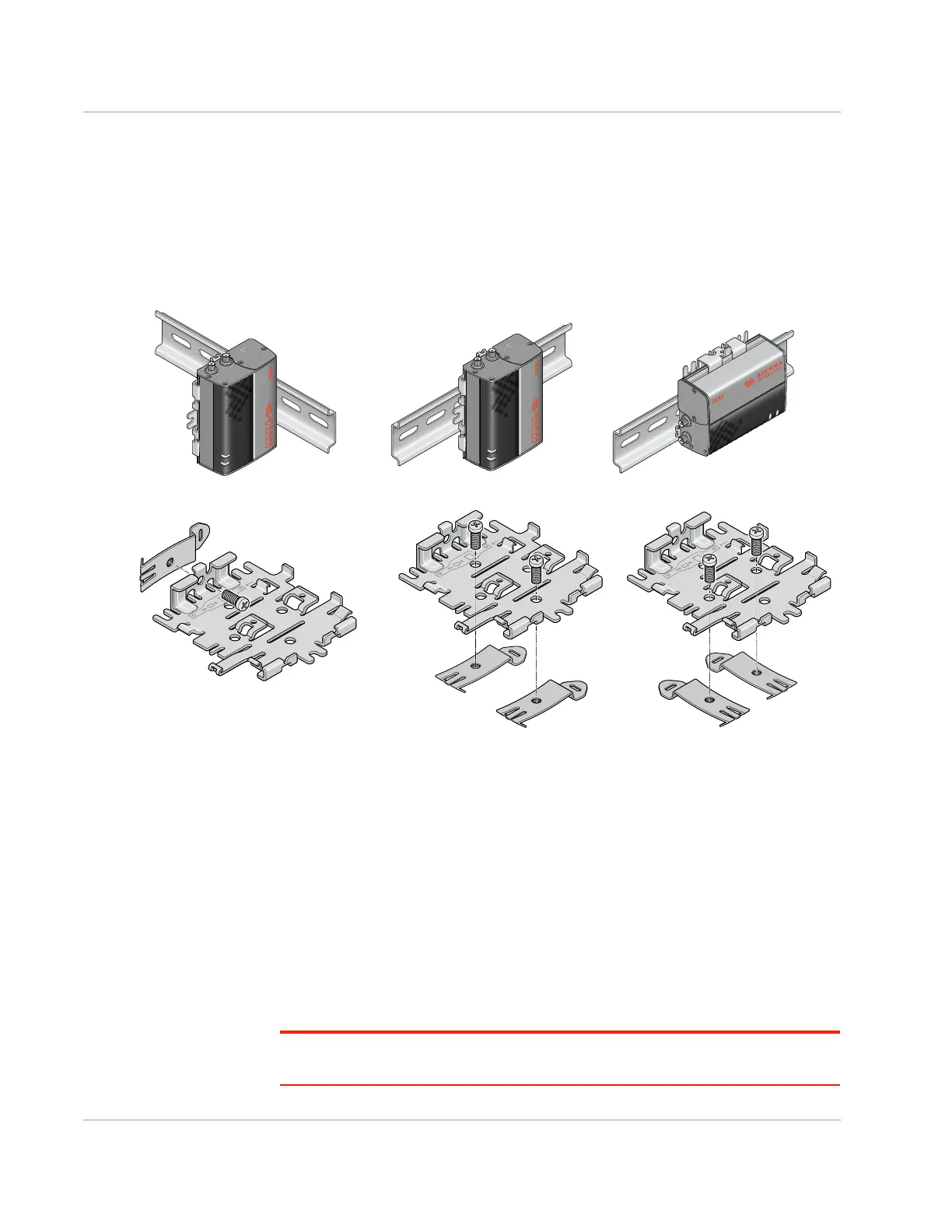 For these orientations, attach two DIN rail clips to the bottom of the bracket.