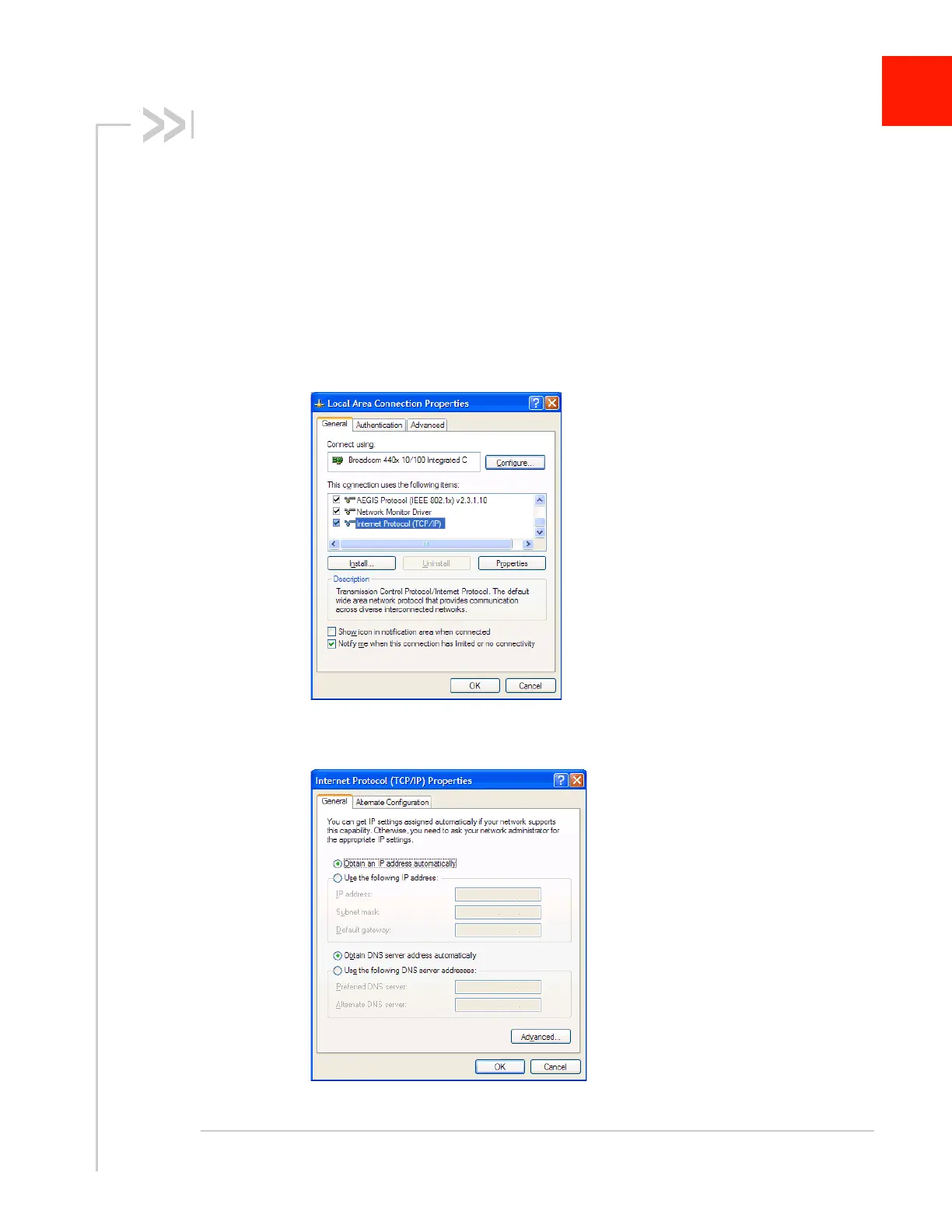 The following steps describe how to set up IP addressing on Windows XP. For other