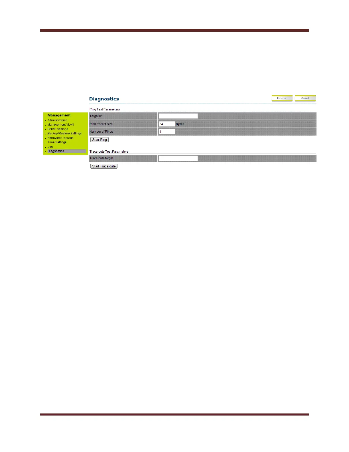 Click on the Diagnostics link under the Management menu. This function allows you to detect