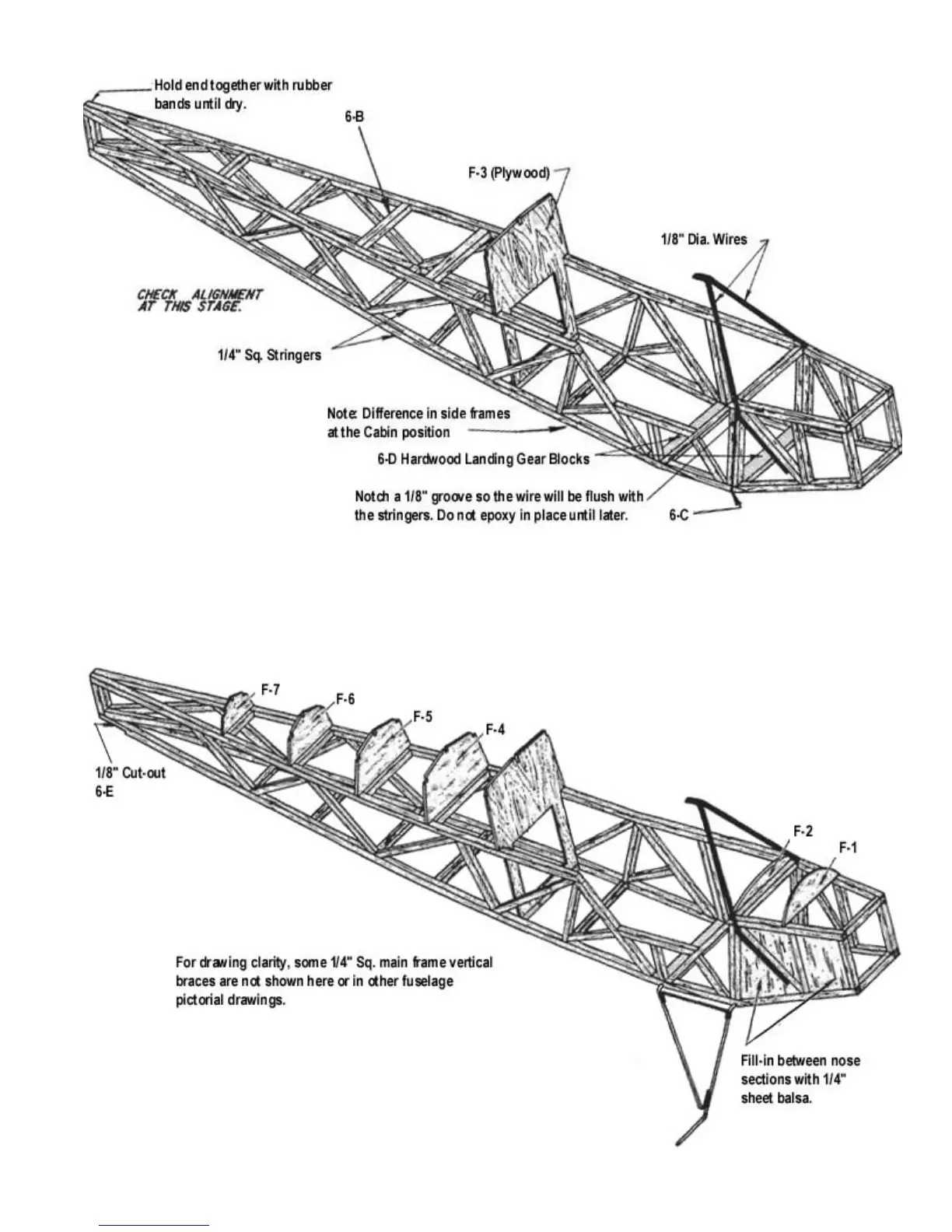 B. Set the fuselage side frames over the top view on the plans and join, using 1/4" square cross pieces and the plywood