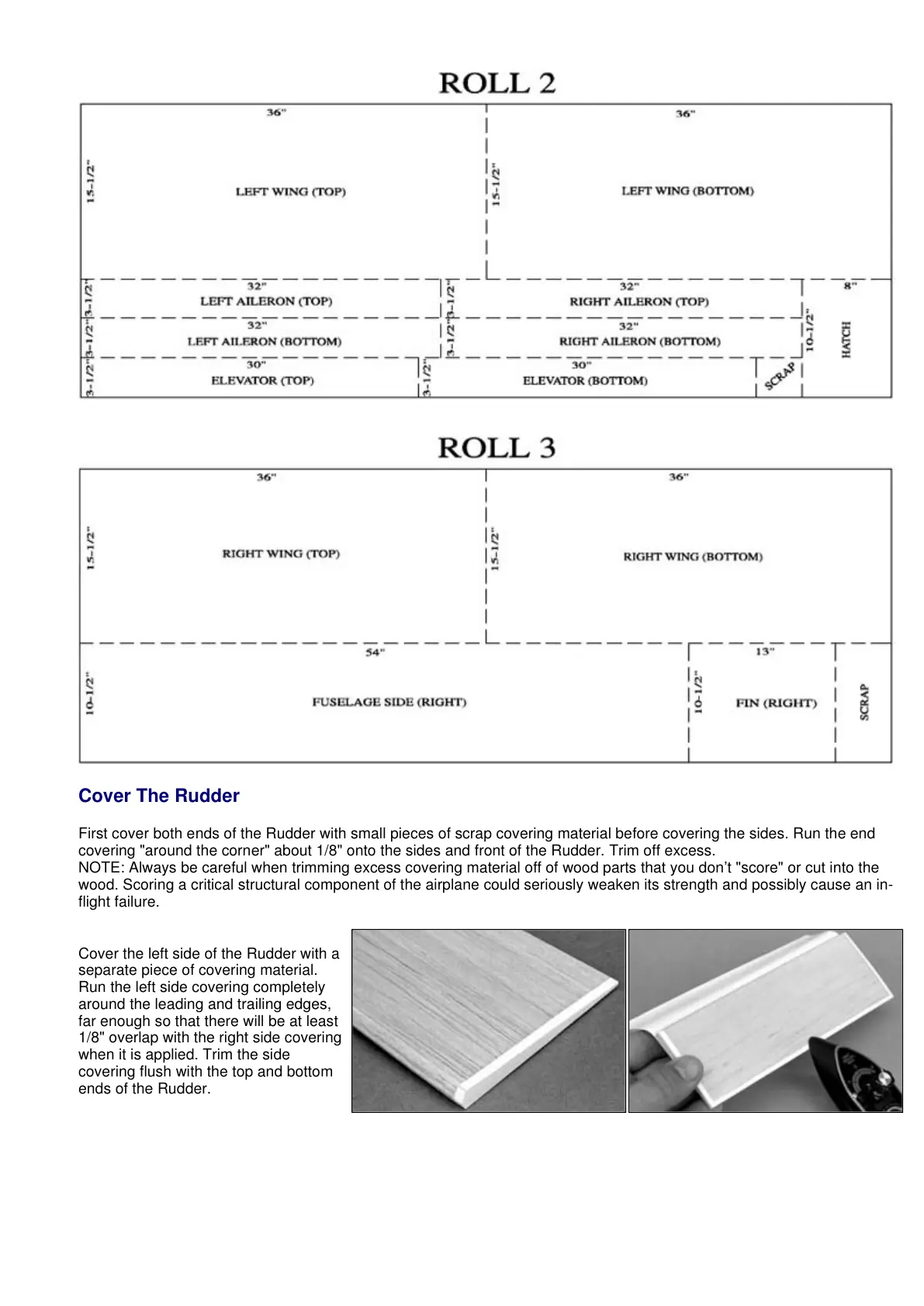 NOTE: Always be careful when trimming excess covering material off of wood parts that you don’t "score" or cut into the