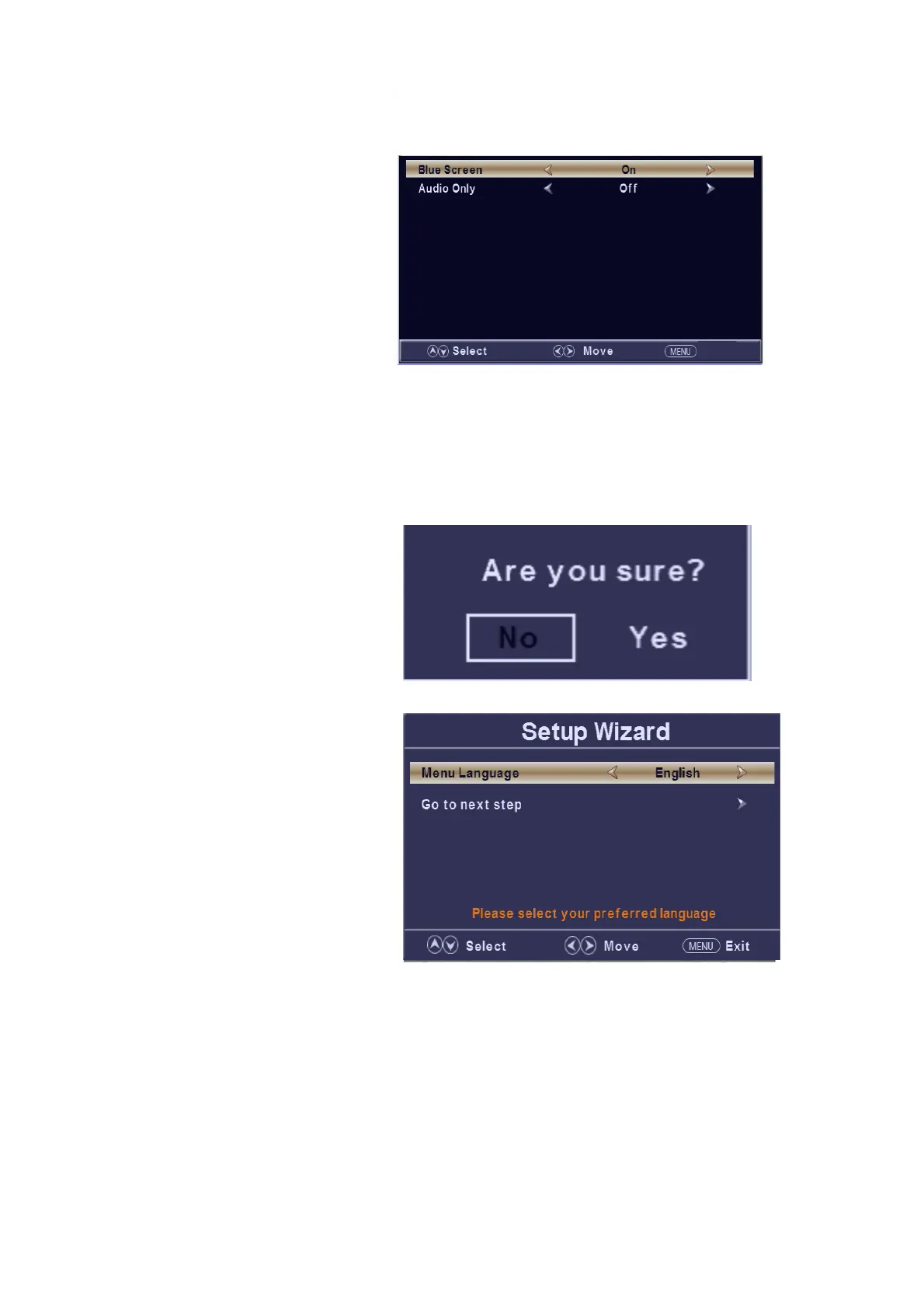 b. Press “c/d” button to select “Blue Screen” the “e/f” button to select “On” or “Off”.