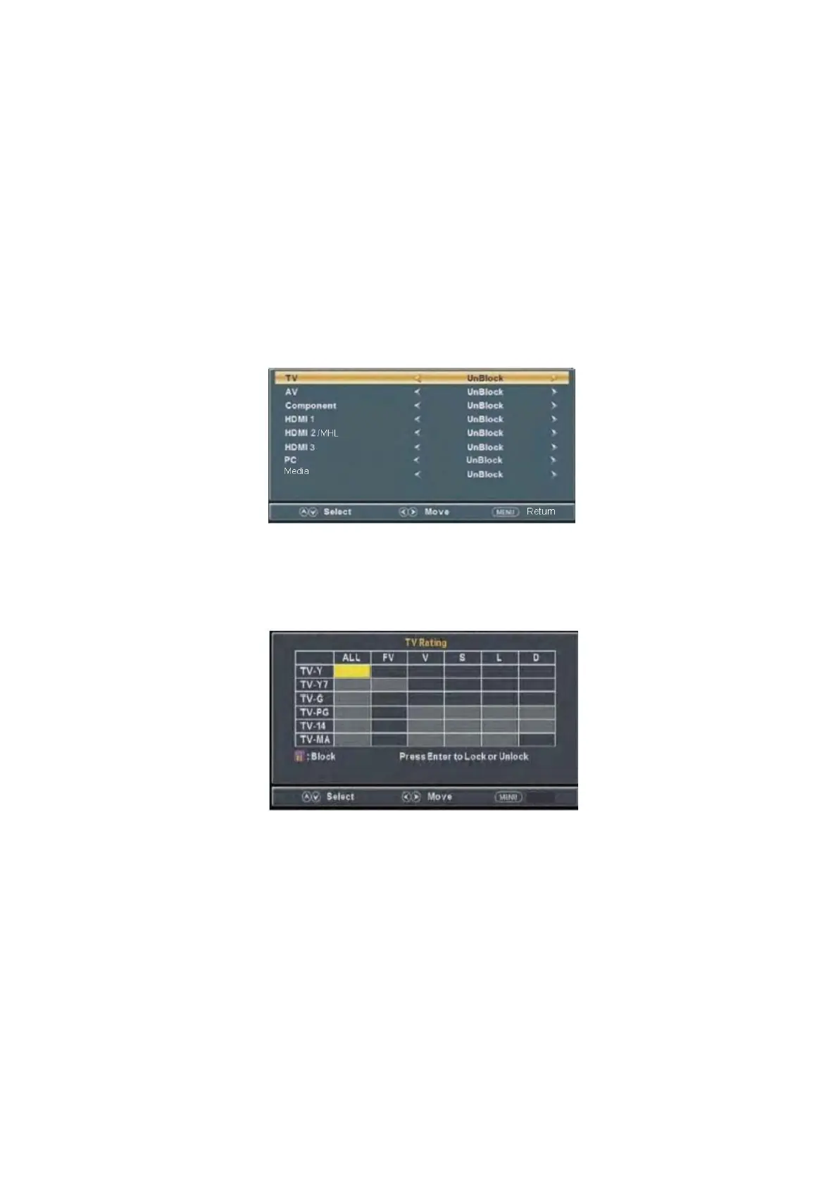 5. Presione el botón “c/d” para seleccionar los " US Rating (Clasificación EUA)" y presione el