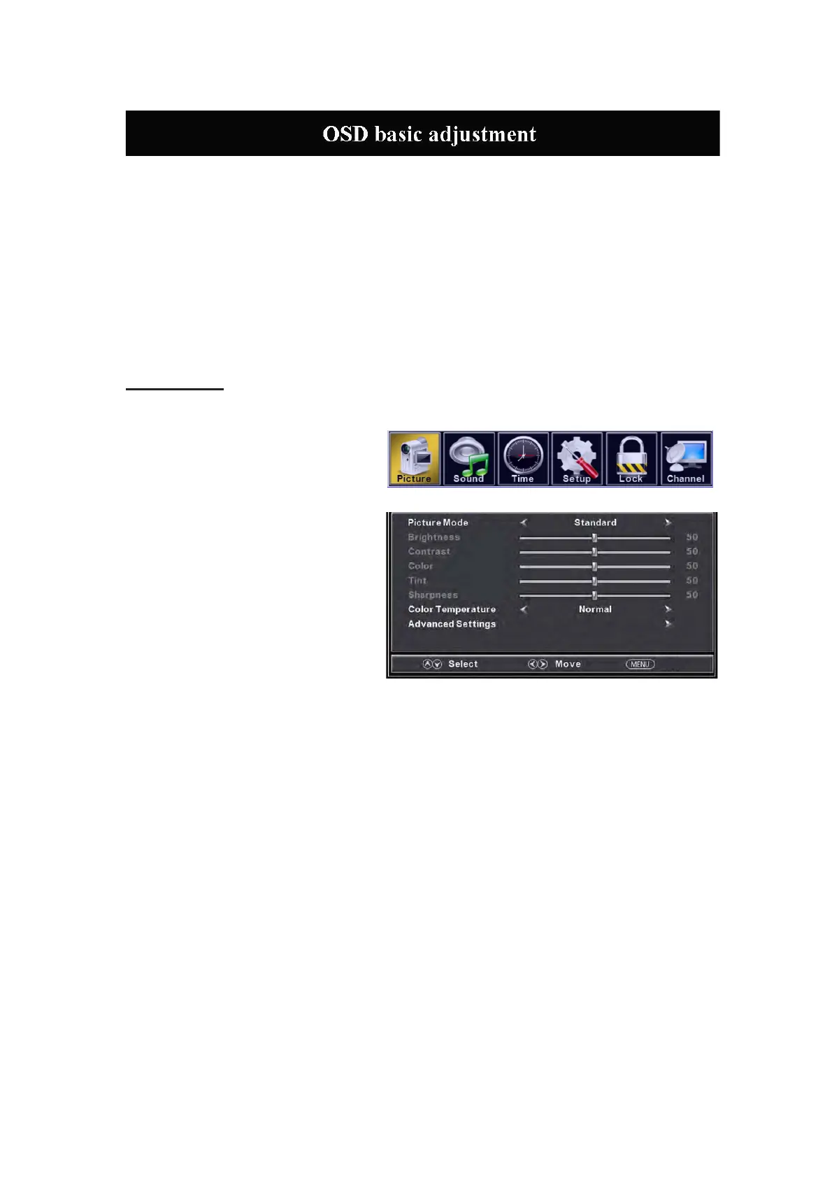 elect the type of picture, which best corresponds to your viewing. Press the “MENU”