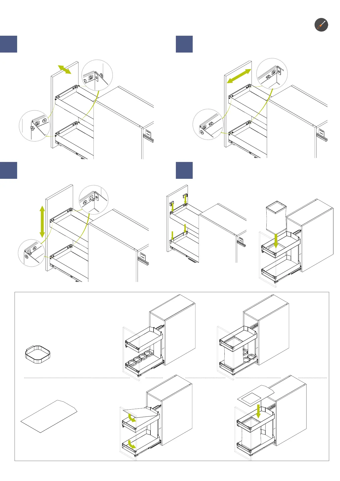 Allentare le quattro M5x5 sui fianchi del cesto per regolare l’antina avanti indietro.