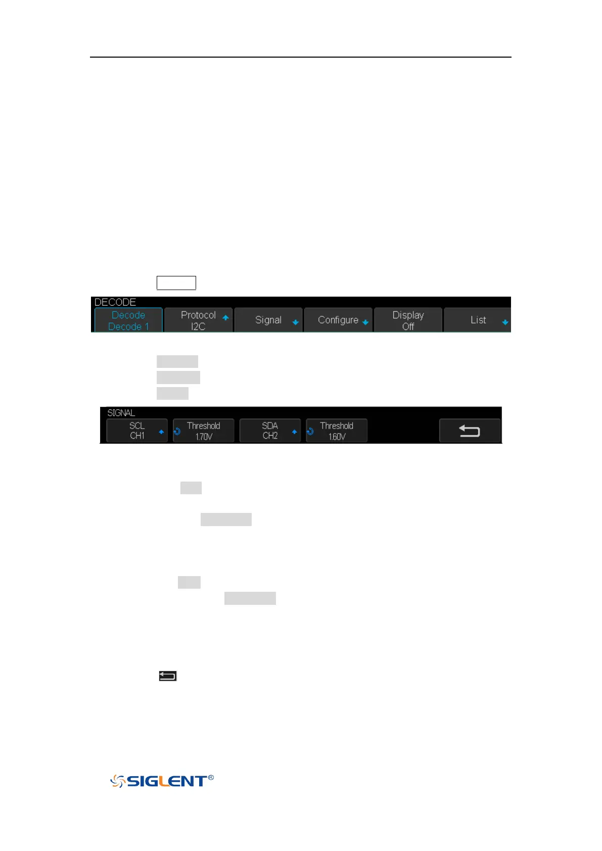 Please in order of “Setup for I2C Signals”, “I2C Trigger” and “I2C Serial Decode” to