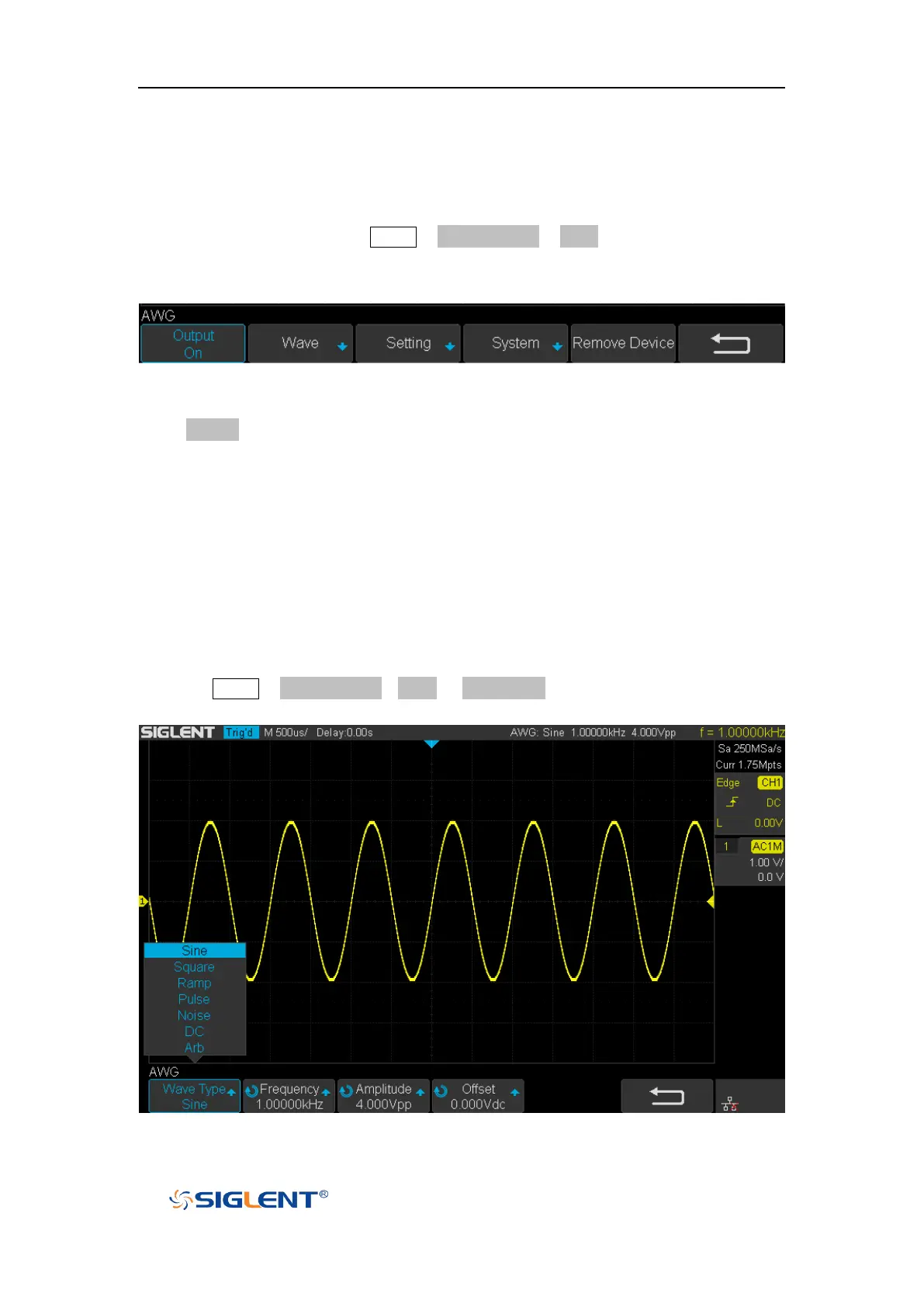 Press Output softkey to open or close the AWG output .When the output is on, the upper