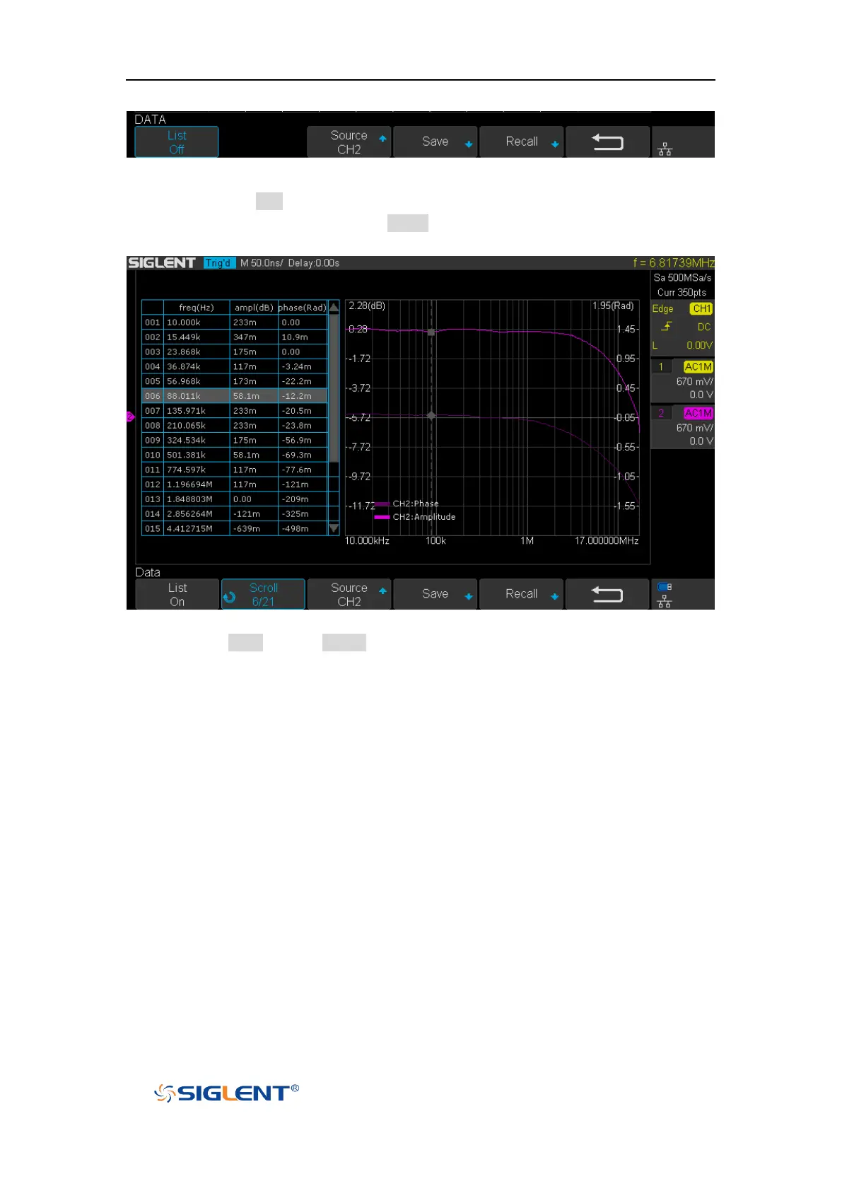 1) Press the List softkey repeatedly to turn the Bode plot data list on or off. After