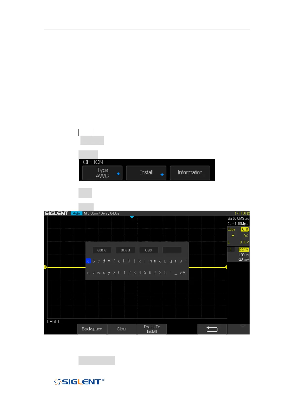5. Press the Install softkey to enter the LABEL function menu to input the license.
