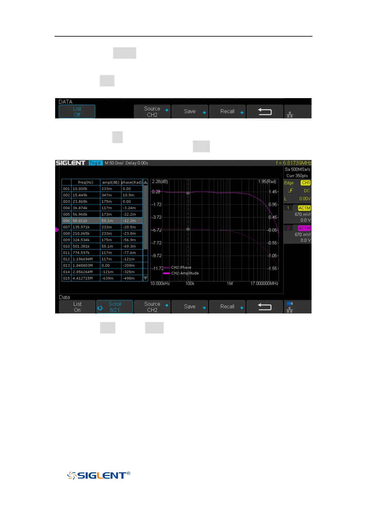 1) Press the List softkey repeatedly to turn the Bode plot data list on or off.