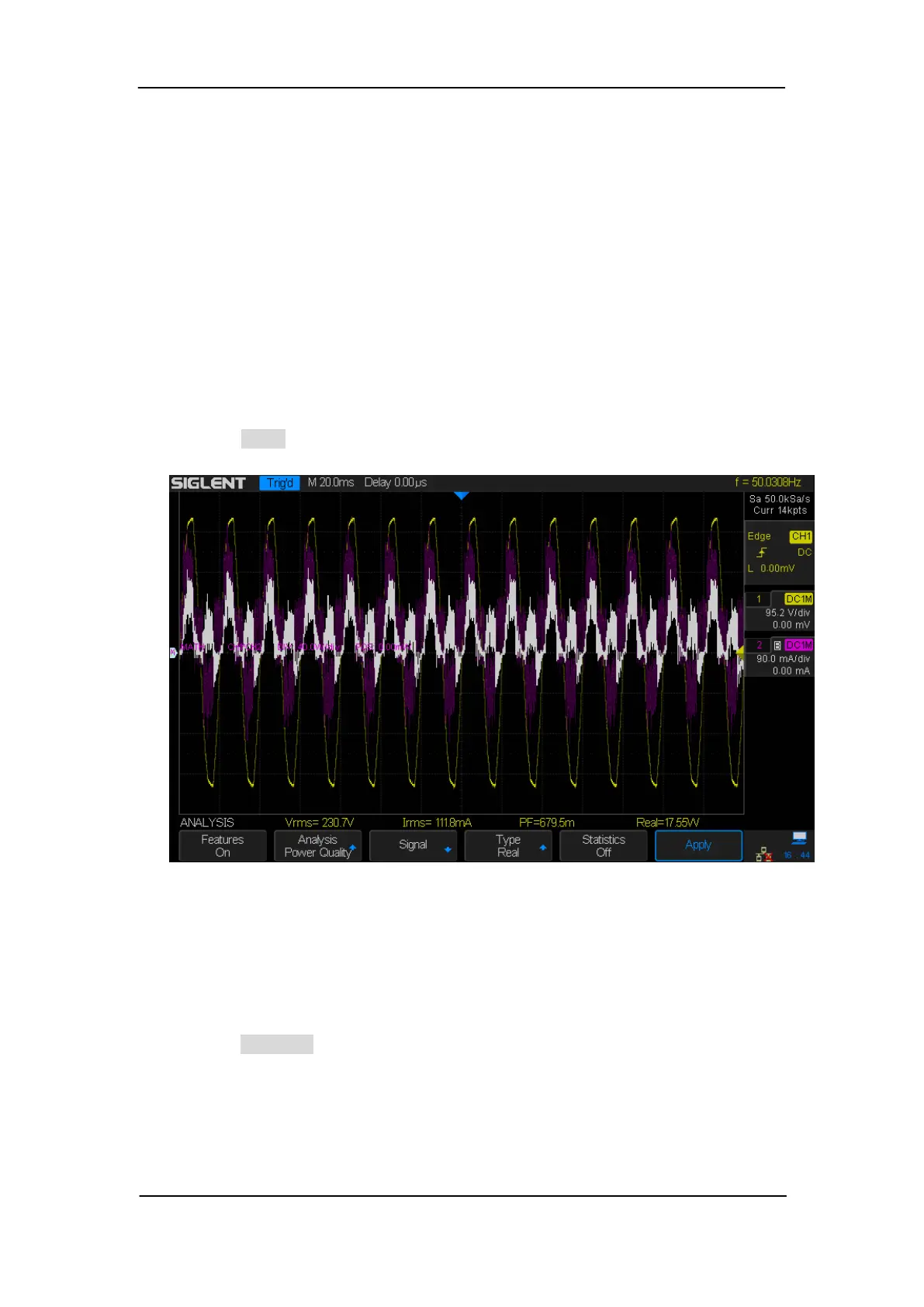 13. Press the Apply softkey to perform analysis to perform power quality analysis.