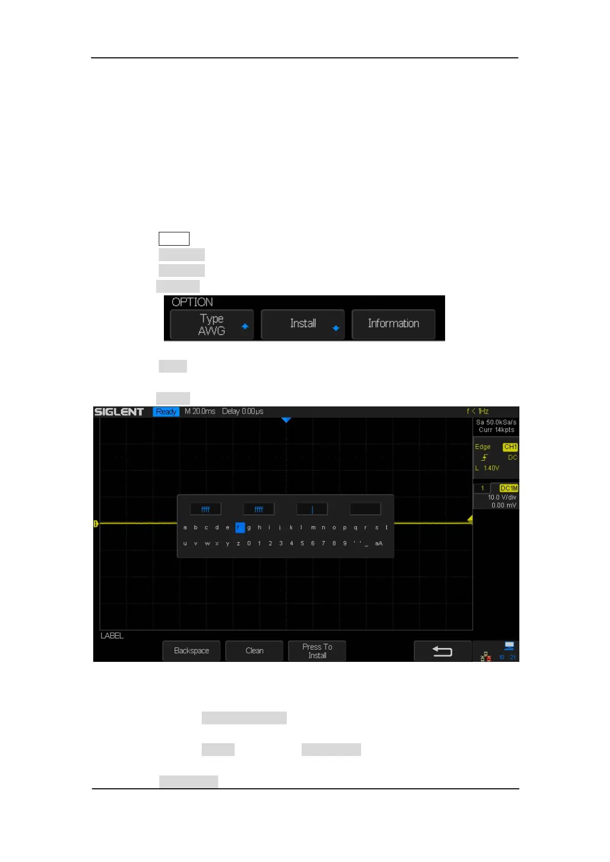 6. Press the Install softkey to enter the LABEL function menu to input the license.
