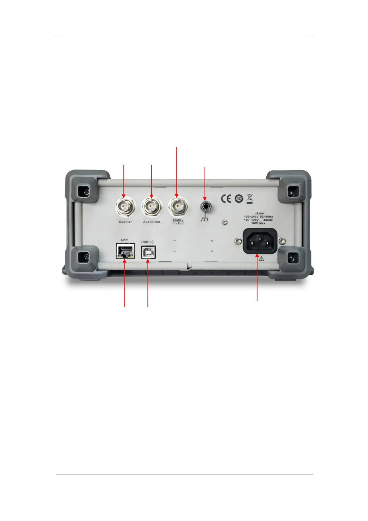The rear panel provides multiple interfaces, including Counter, 10MHz In/Out,