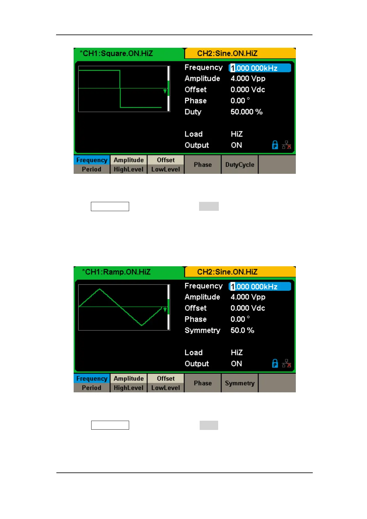 3. Press Waveforms key and then press Ramp softkey. The generator can