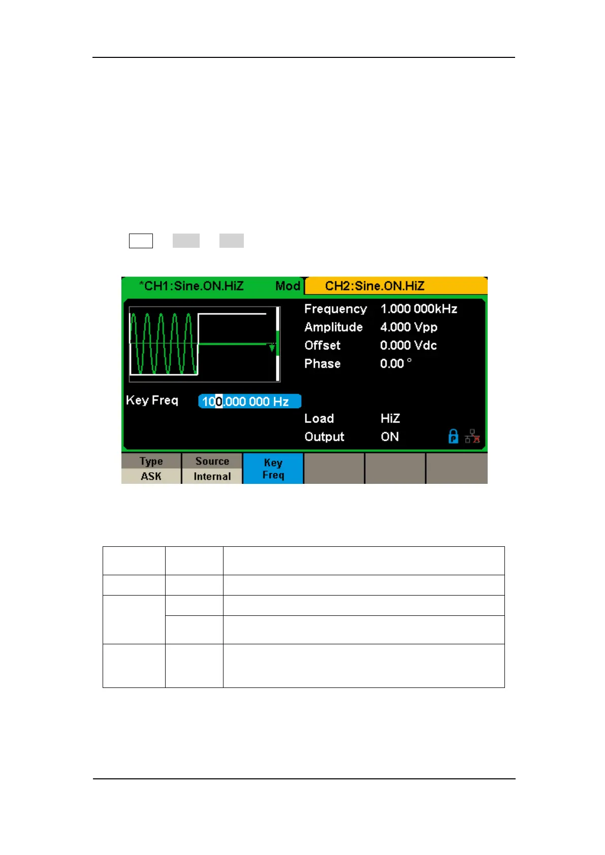 Press Mod → Type → ASK, the parameters of ASK modulation are shown in