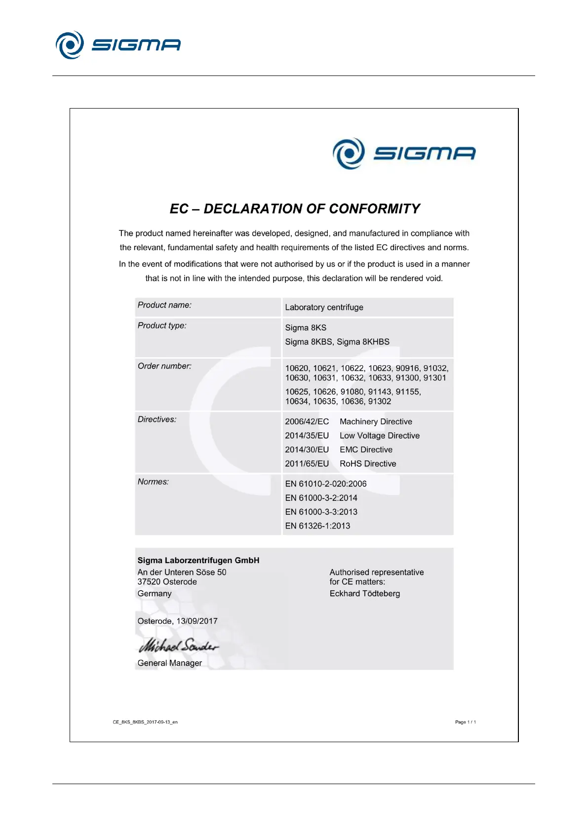 Pos: 256 /100 Sig ma/110 BA Z entrifugen Sig ma (Projekte)/8K S_8KBS_8KHB S/110 Anhang/ 110-0060 K onformitätser klärung 8KS_8K BS_8KHBS @ 29 \mod_140532 7503983_68. docx @ 19998 3 @ 2 @ 1