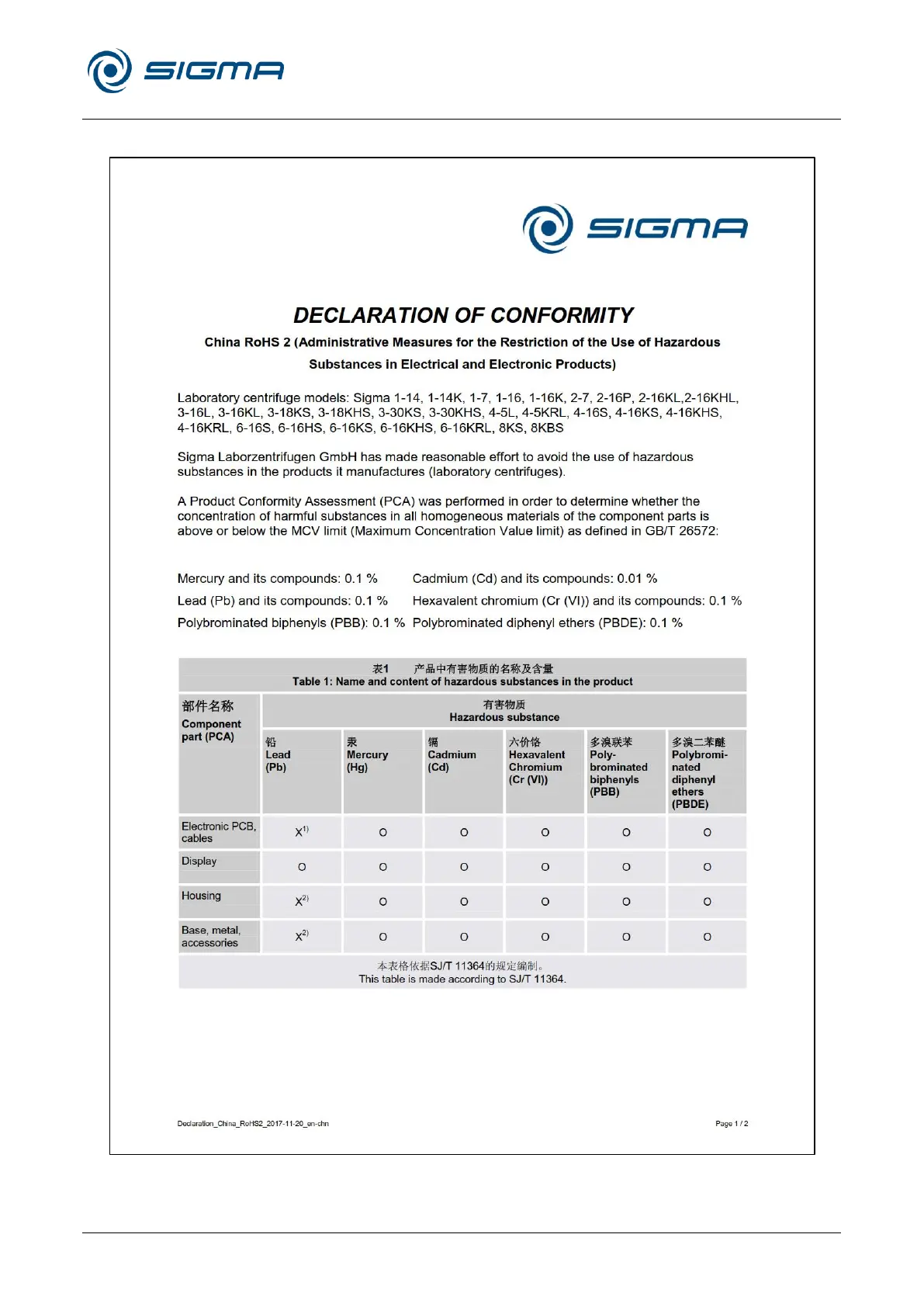 Sigma 8KBS - Declaration of Conformity - China Rohs 2
