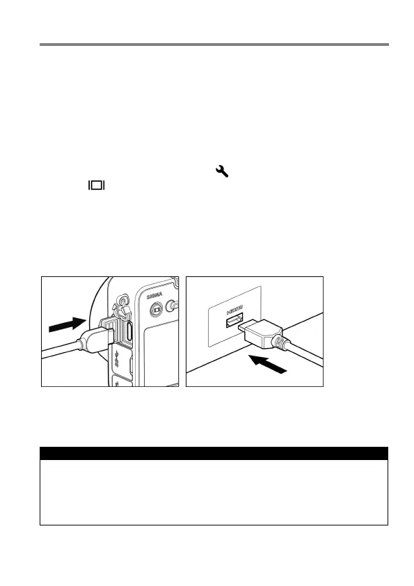 With the HDMI cable, connect the camera and the television. Then turn the