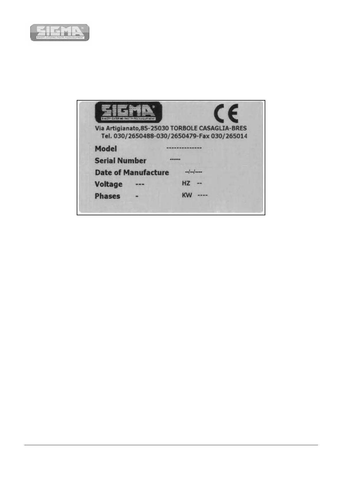 manufacturer, type of machine, serial number, electrical features, frequency, rated power, number of phases, year