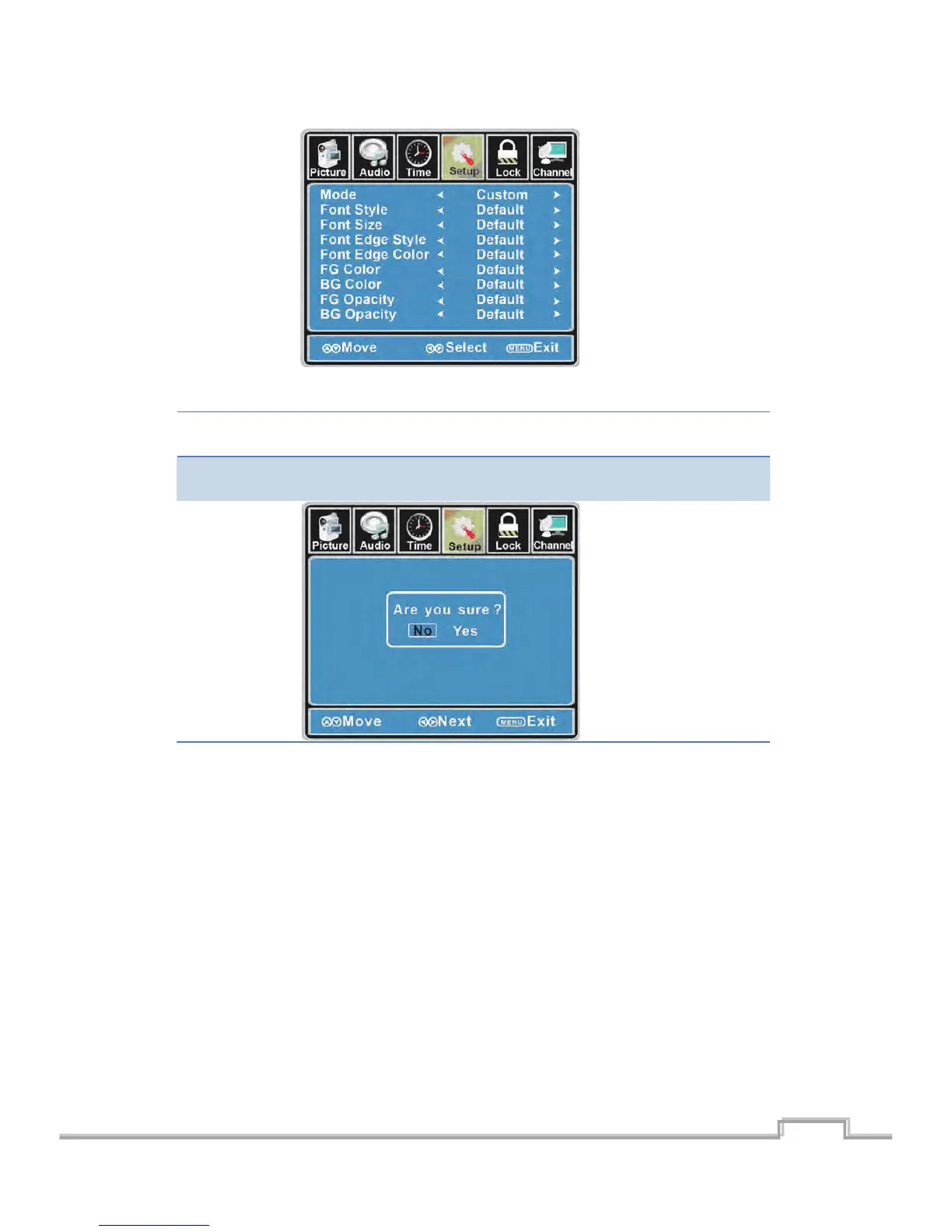 Restore Default Restore all sengs in SETUP menu to factory sengs.