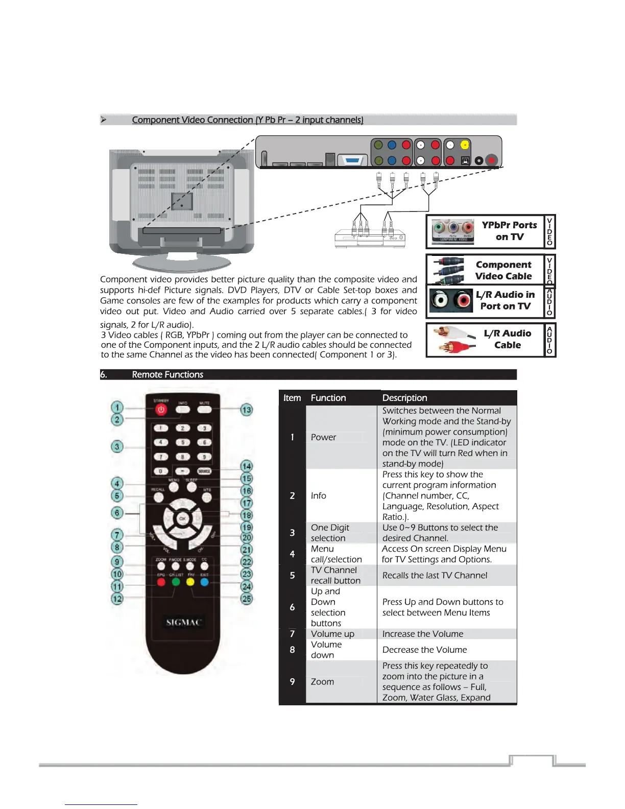 Sigmac NE42AB - Component Video Connection; Component Video and Audio Setup; Remote Functions; Remote Control Buttons Explained