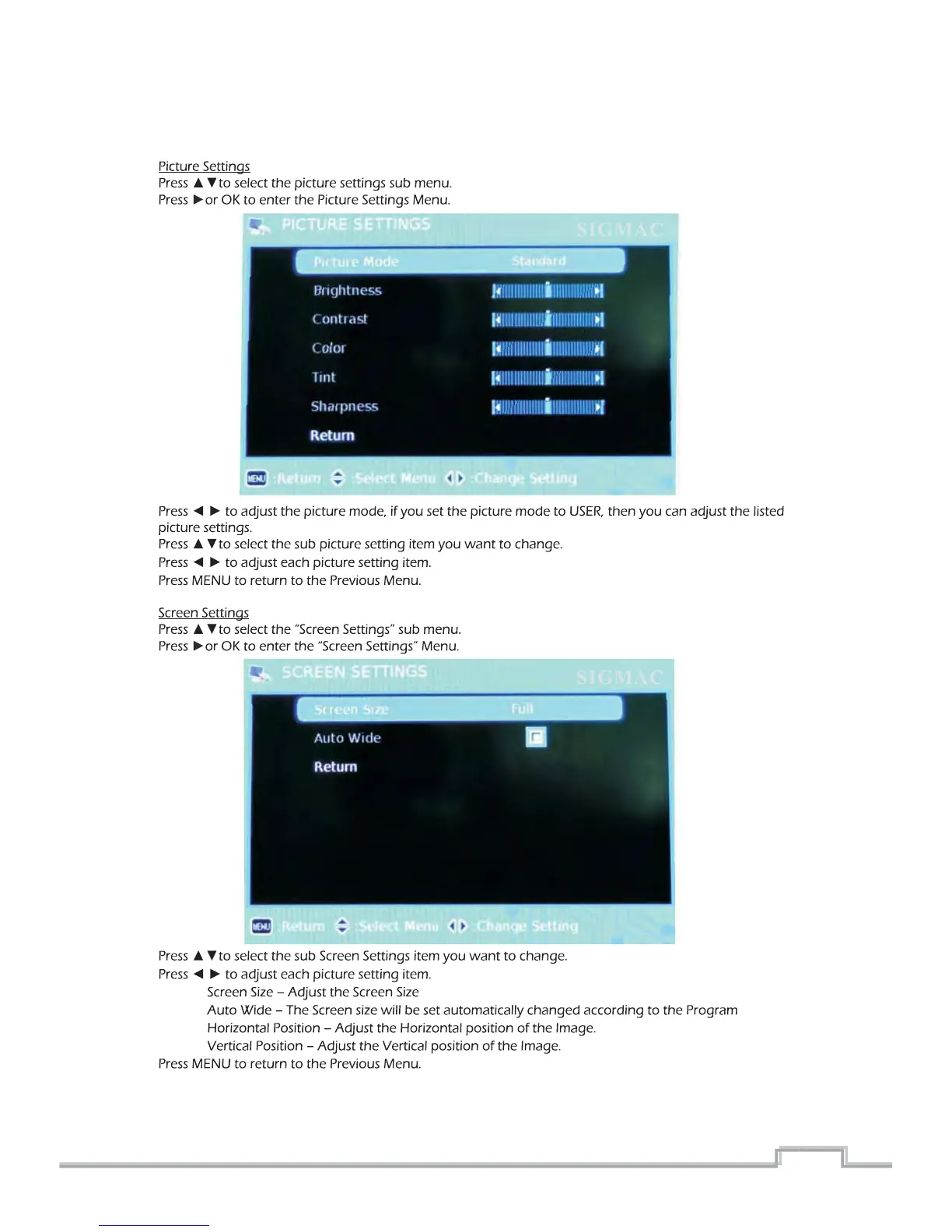 Sigmac NE42AB - Picture Settings; Picture Configuration Options; Screen Settings; Screen Size and Aspect Ratio