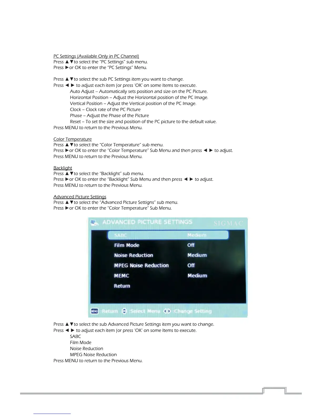 Sigmac NE42AB - PC Settings; PC Input Configuration; Color Temperature; Color Temperature Adjustment