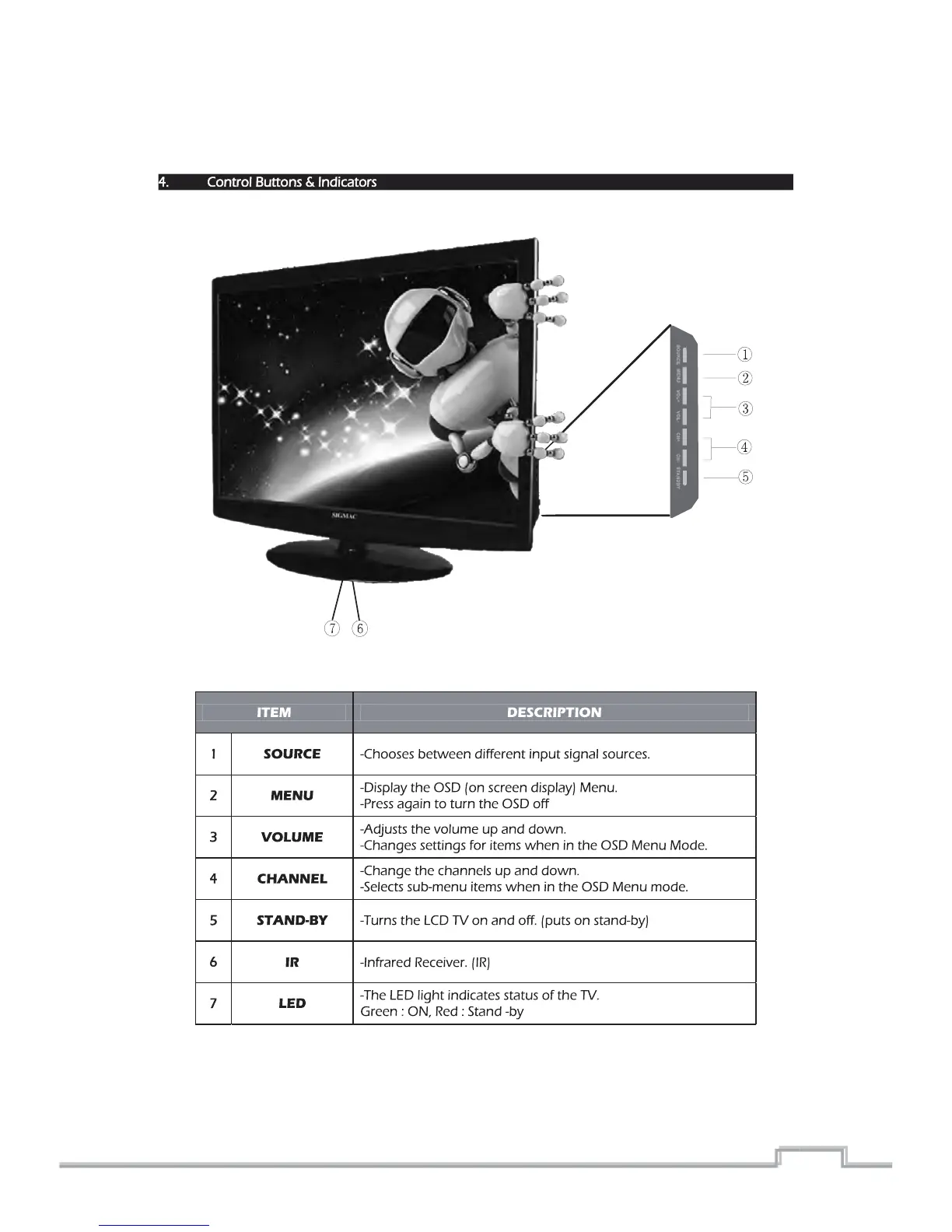 Sigmac NE42AB - Control Buttons & Indicators; TV Control Panel Overview