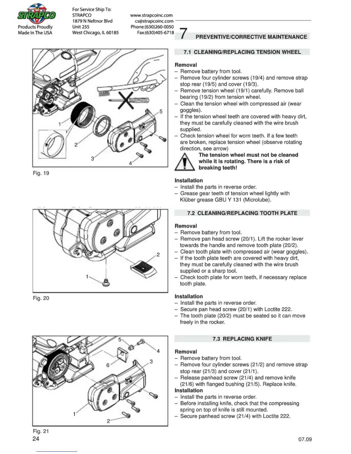 Signode BXT2 - Preventive;Corrective Maintenance; Cleaning;Replacing Tension Wheel; Cleaning;Replacing Tooth Plate; Replacing Knife