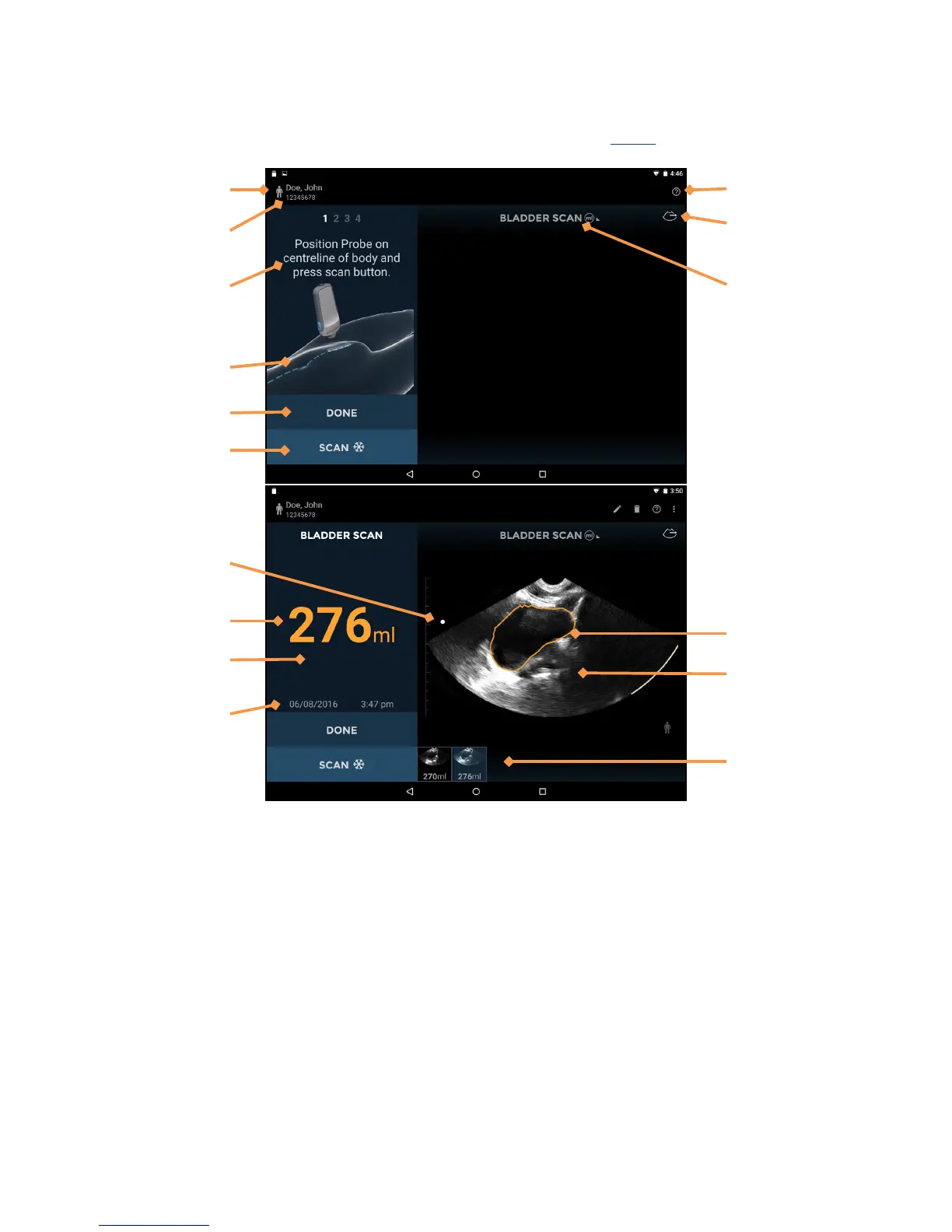 Tap Bladder Scan on the Home screen to start a bladder measurement. See Fig 2.7 for bladder screen layouts.