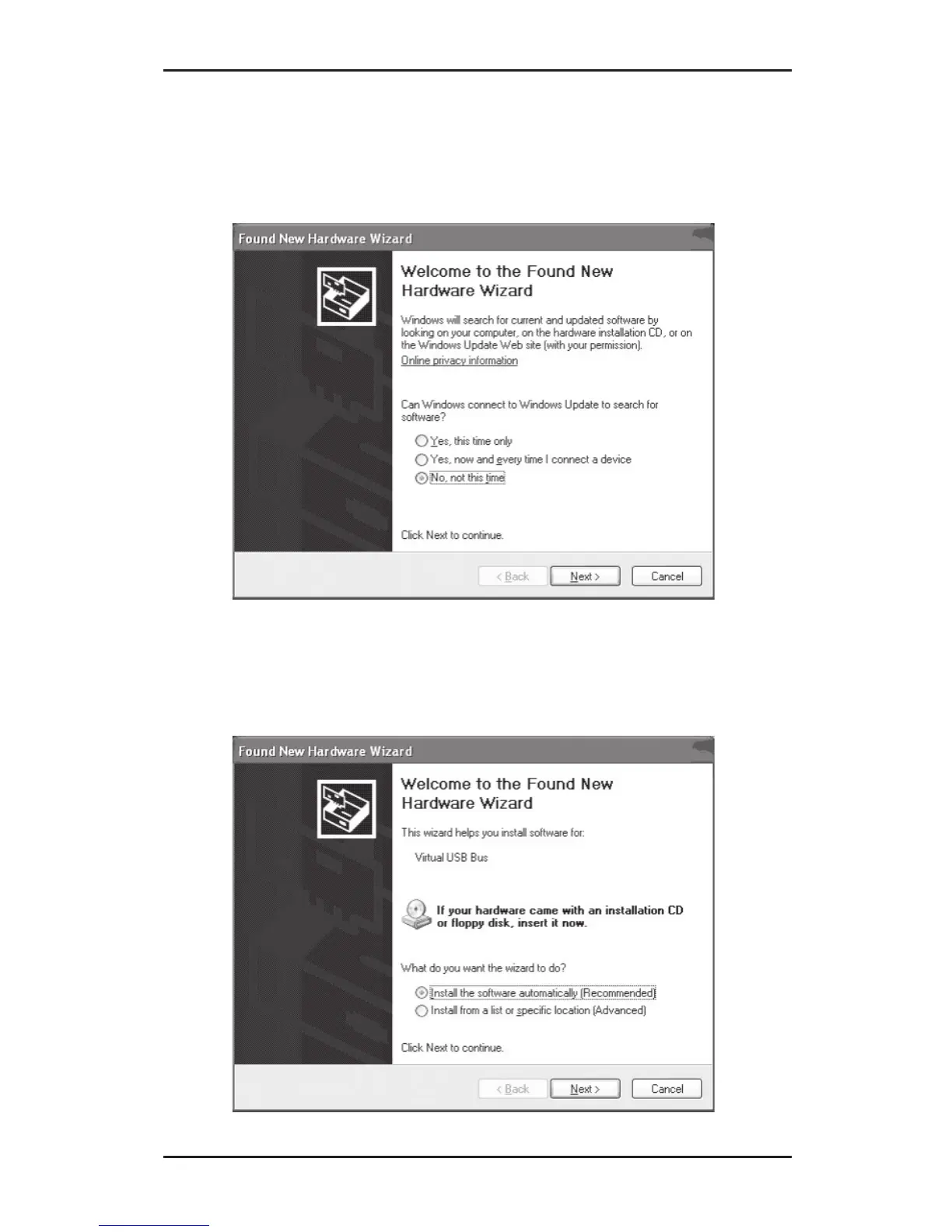 9. At the Found New Hardware Wizard, select No,