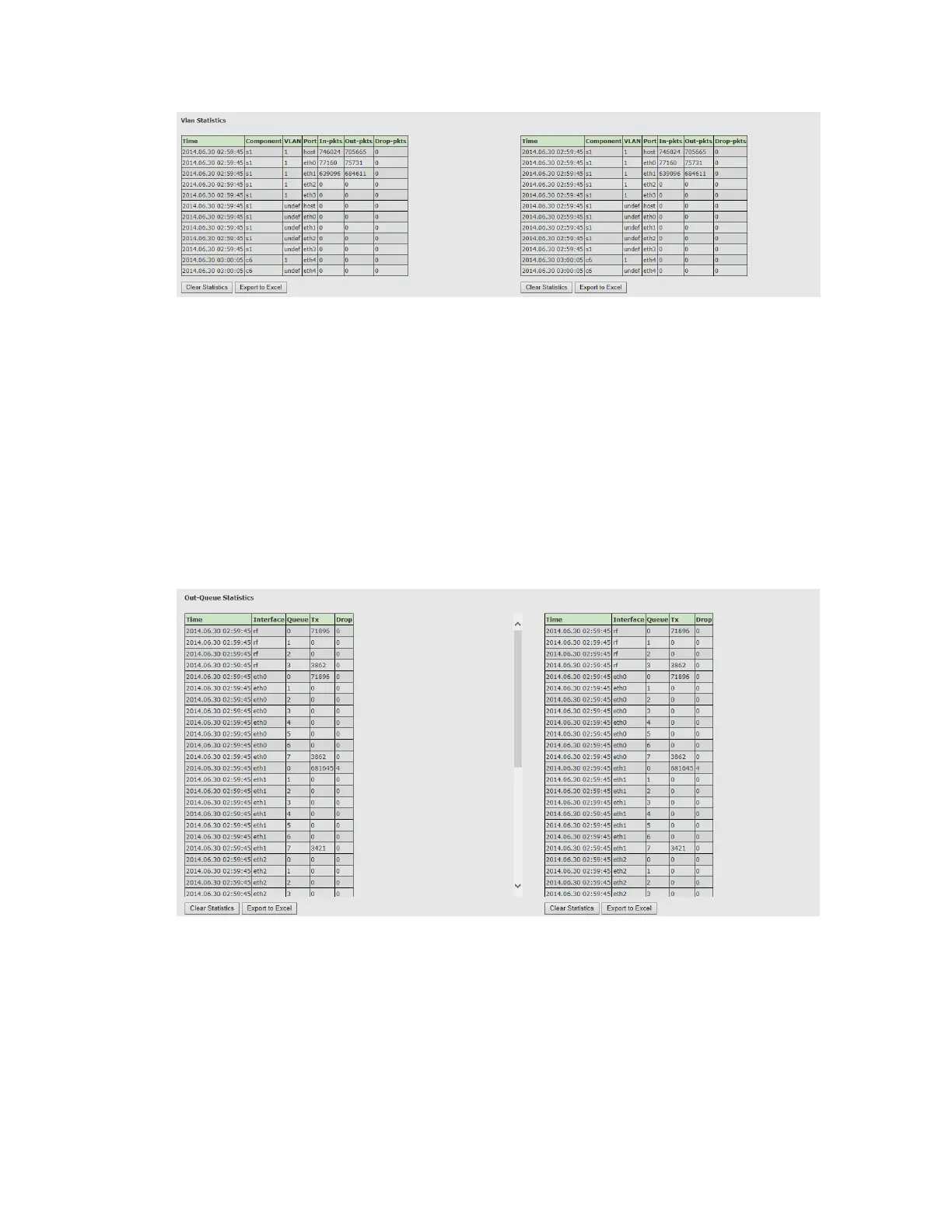 Queue statistics for outgoing queues and incoming queues per port. Packets counters