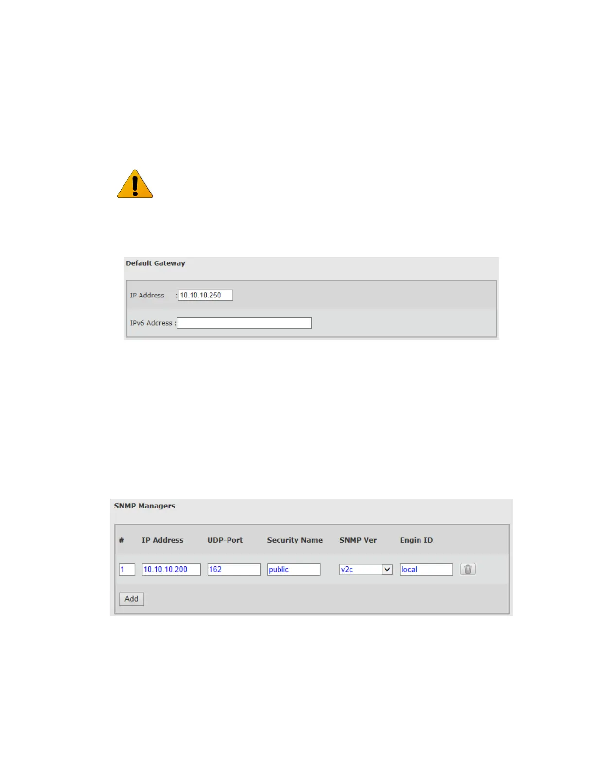 This section allows configuring a single default gateway for IPv4 and IPv6.