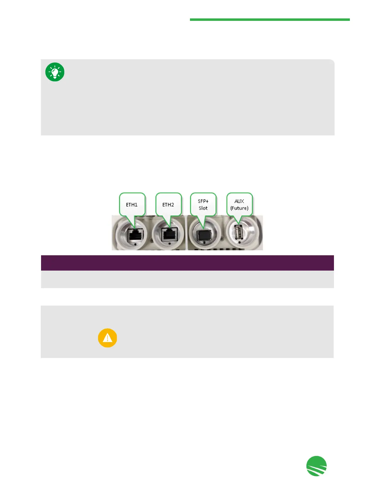 The MultiHaul™ TG node includes the following ports on the connector panel under the node, as shown and