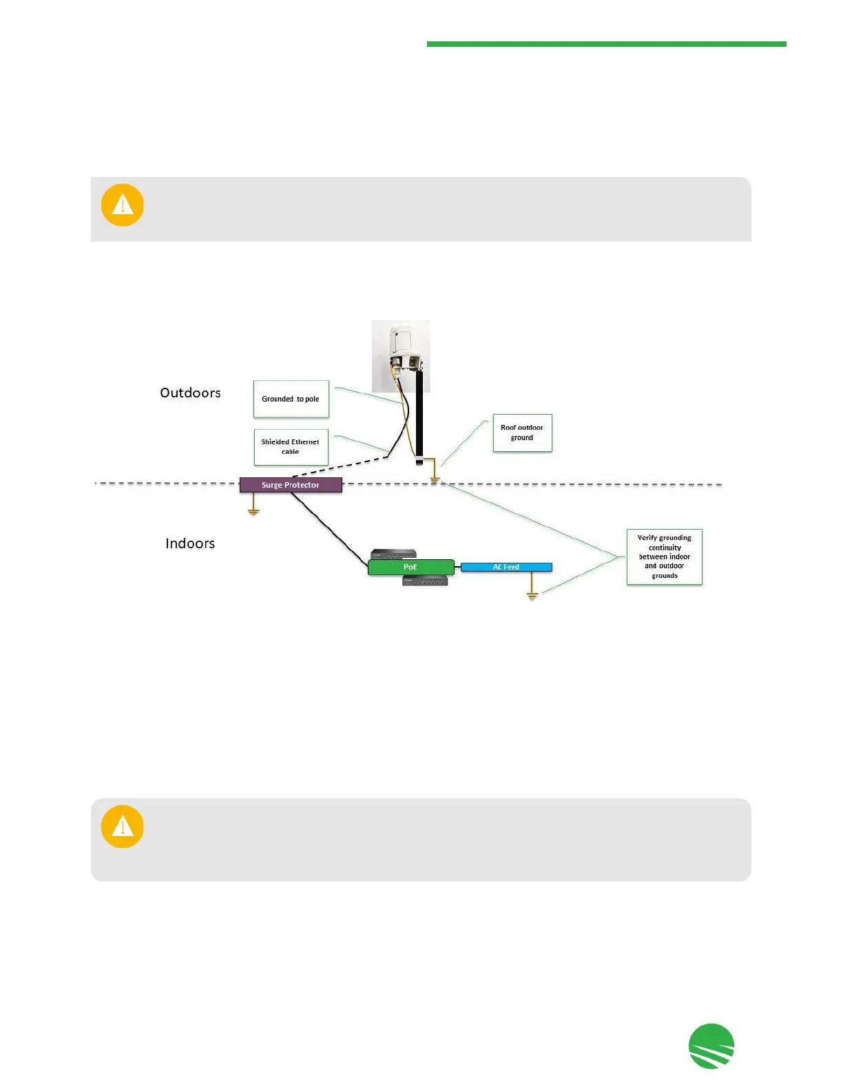 lightning surge arrester should be installed next to the cable point-of-entry and must be properly grounded, as shown in