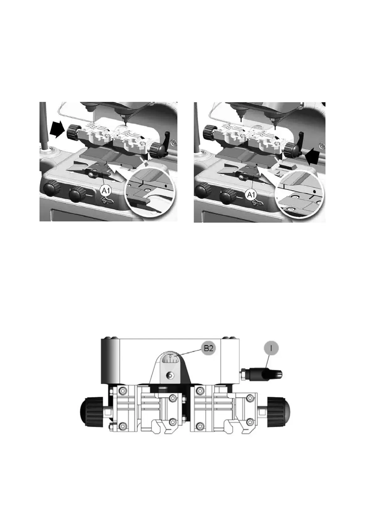 1) Turn the lever (A1) anti-clockwise to move the clamp sideways and/or remove it. Turn the lever (A1) clockwise