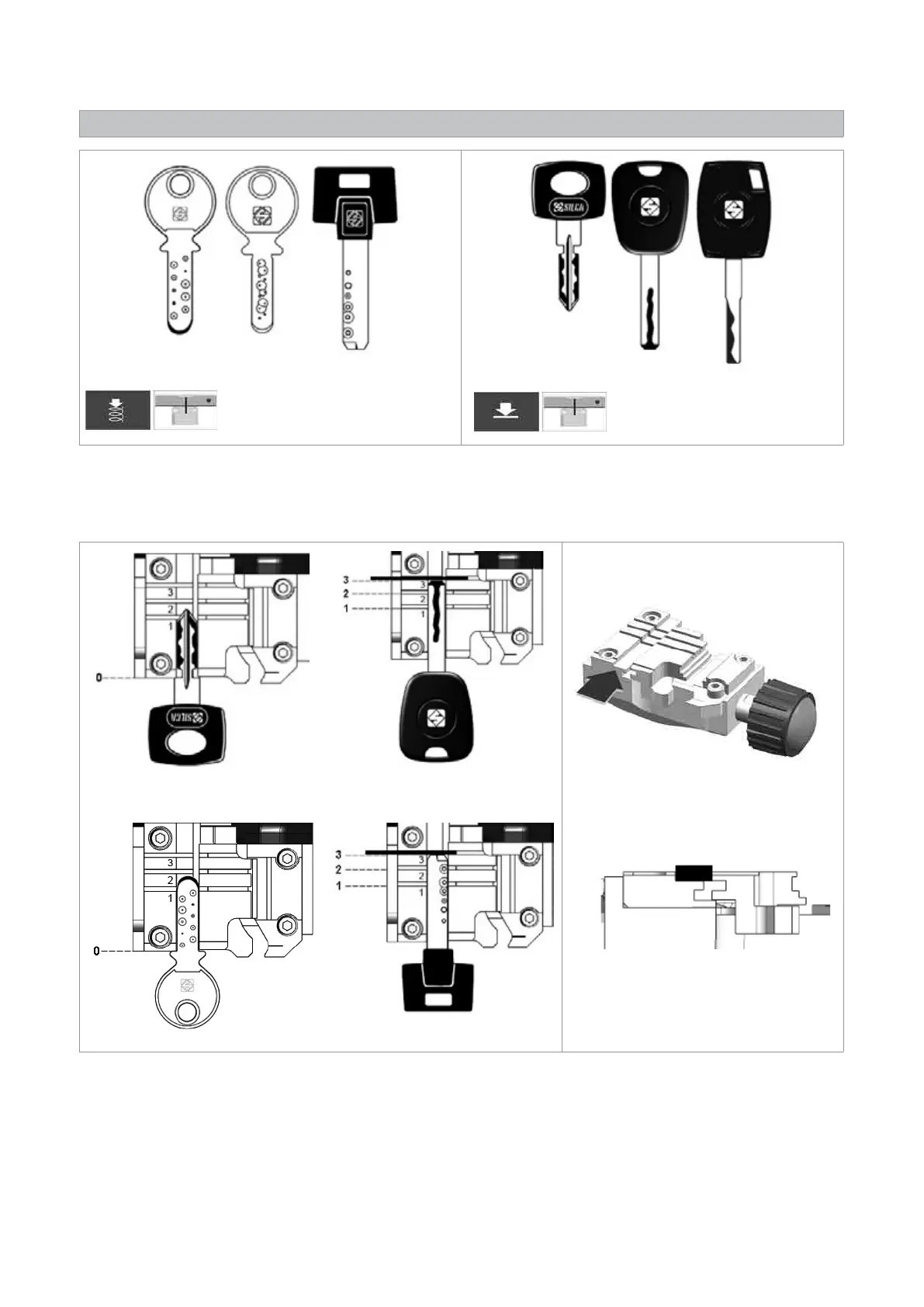 Use the left-hand part of the clamp for keys with head stop (stop 0) or tip stop (Stop 1 - Stop 2 - Stop 3).
