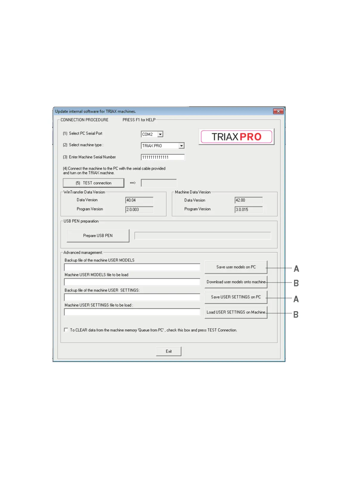 A = button to save the machine data on the PC (user cutting cards, user data, etc....)