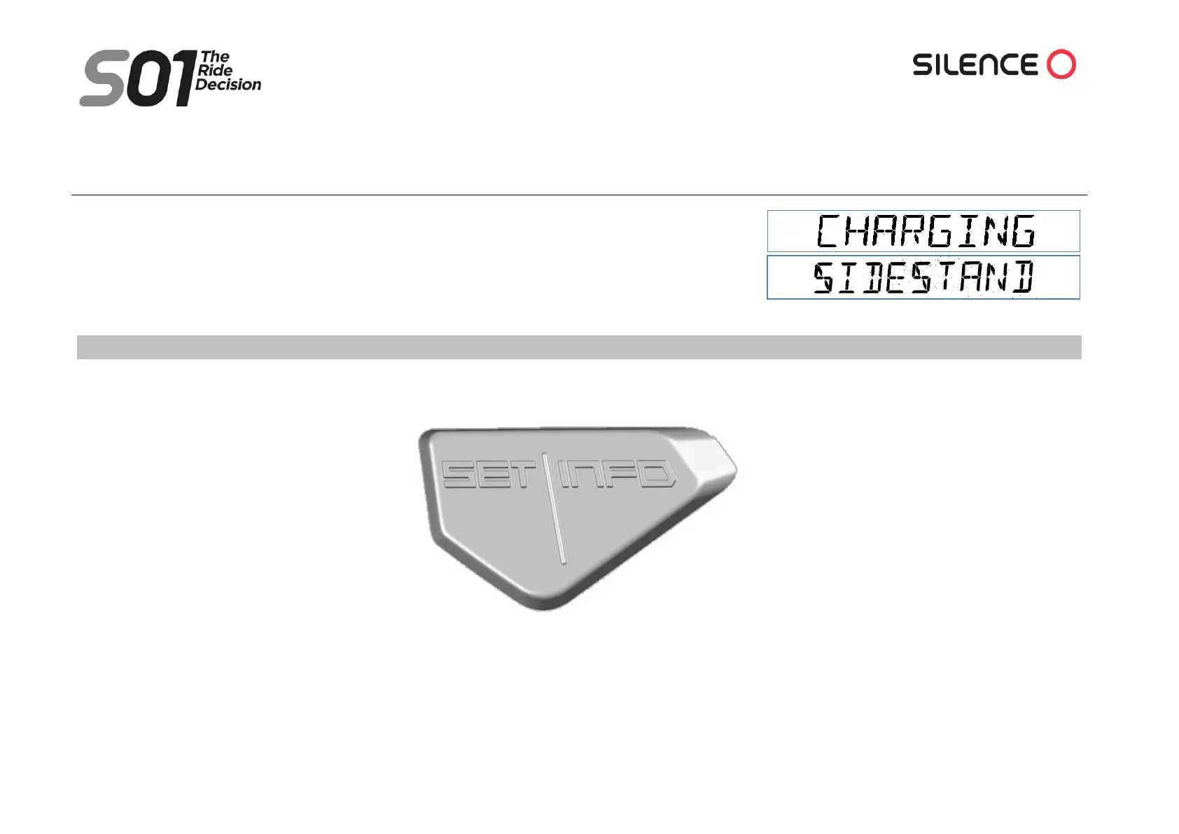 The buttons on the dashboard are SET (left) and INFO (right, and the same on the controls on the right side of the handlebar):