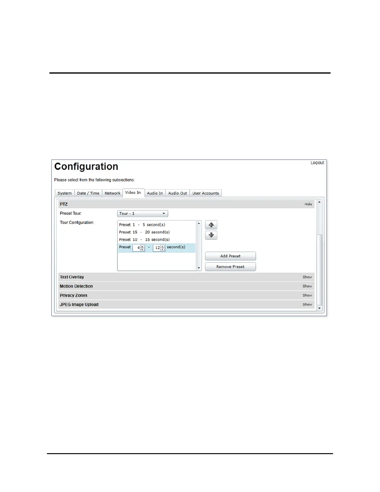 The PTZ preset tours can be set up from the PTZ sub-section of the video input configuration