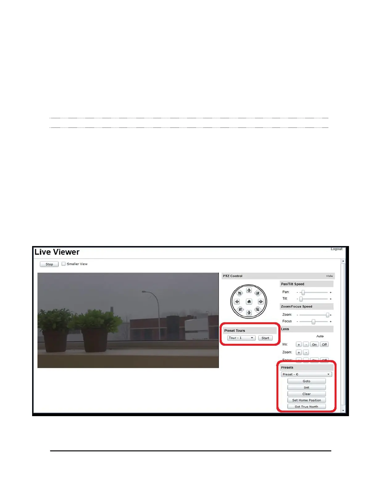 the preset tour in the Preset Tours sub-section and press the Start button to start the tour.