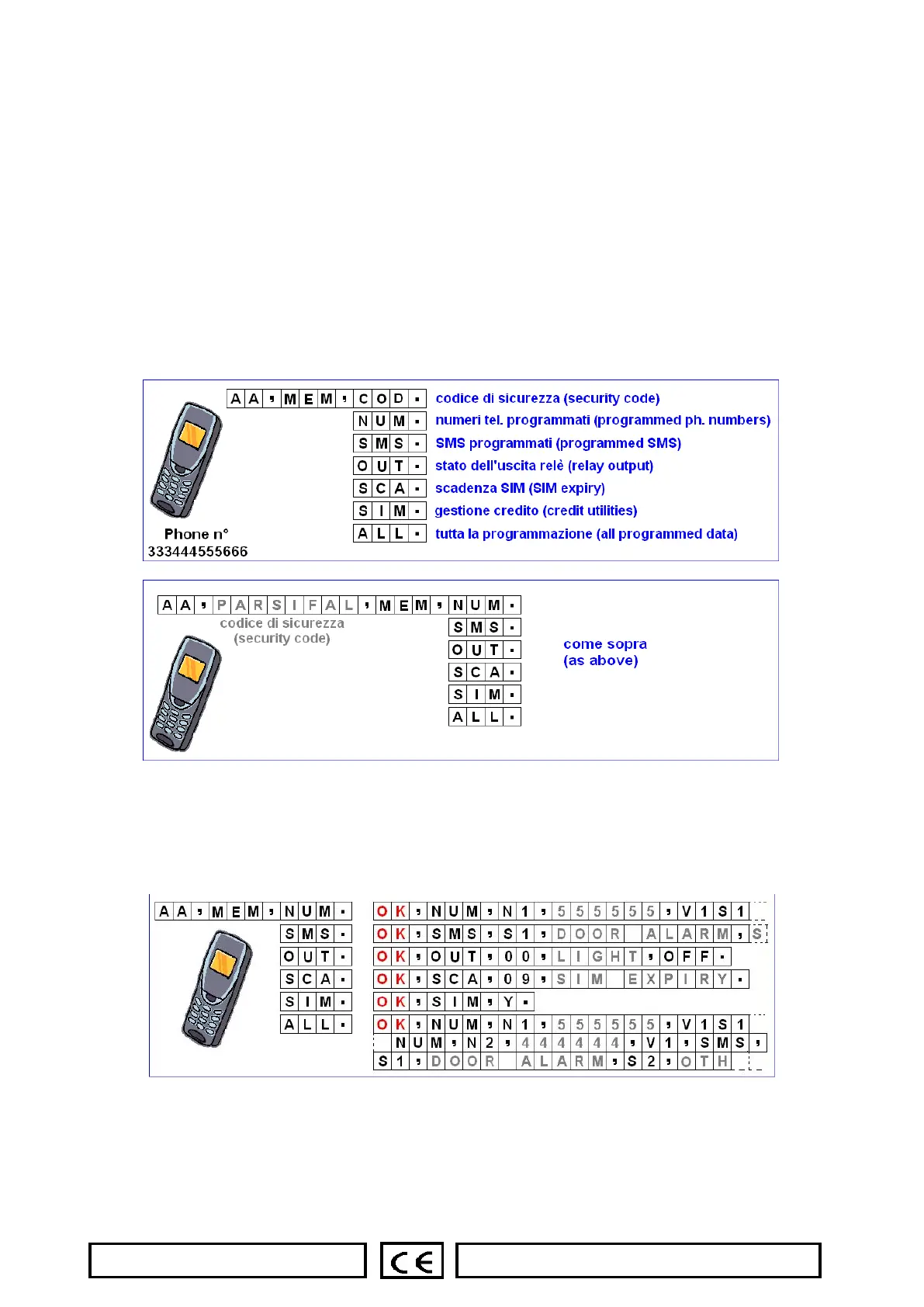 By sending a request SMS, you will receive an answer SMS, whose meaning is intuitive if you know well the device. In the example below, you
