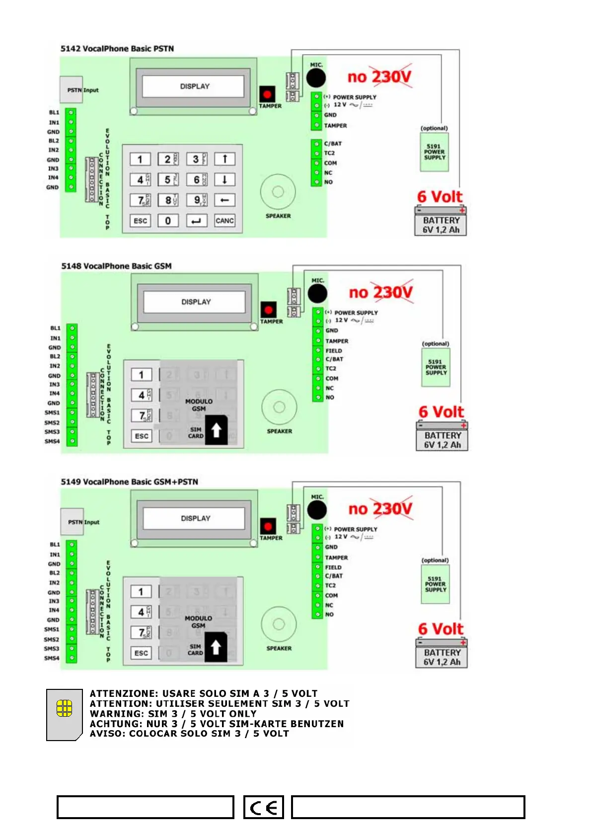 SILENTRON VOCALPHONE BASIC - Device Connection Schematics; Vocalphone Basic PSTN Connections; Vocalphone Basic GSM Connections; Vocalphone Basic GSM+PSTN Connections